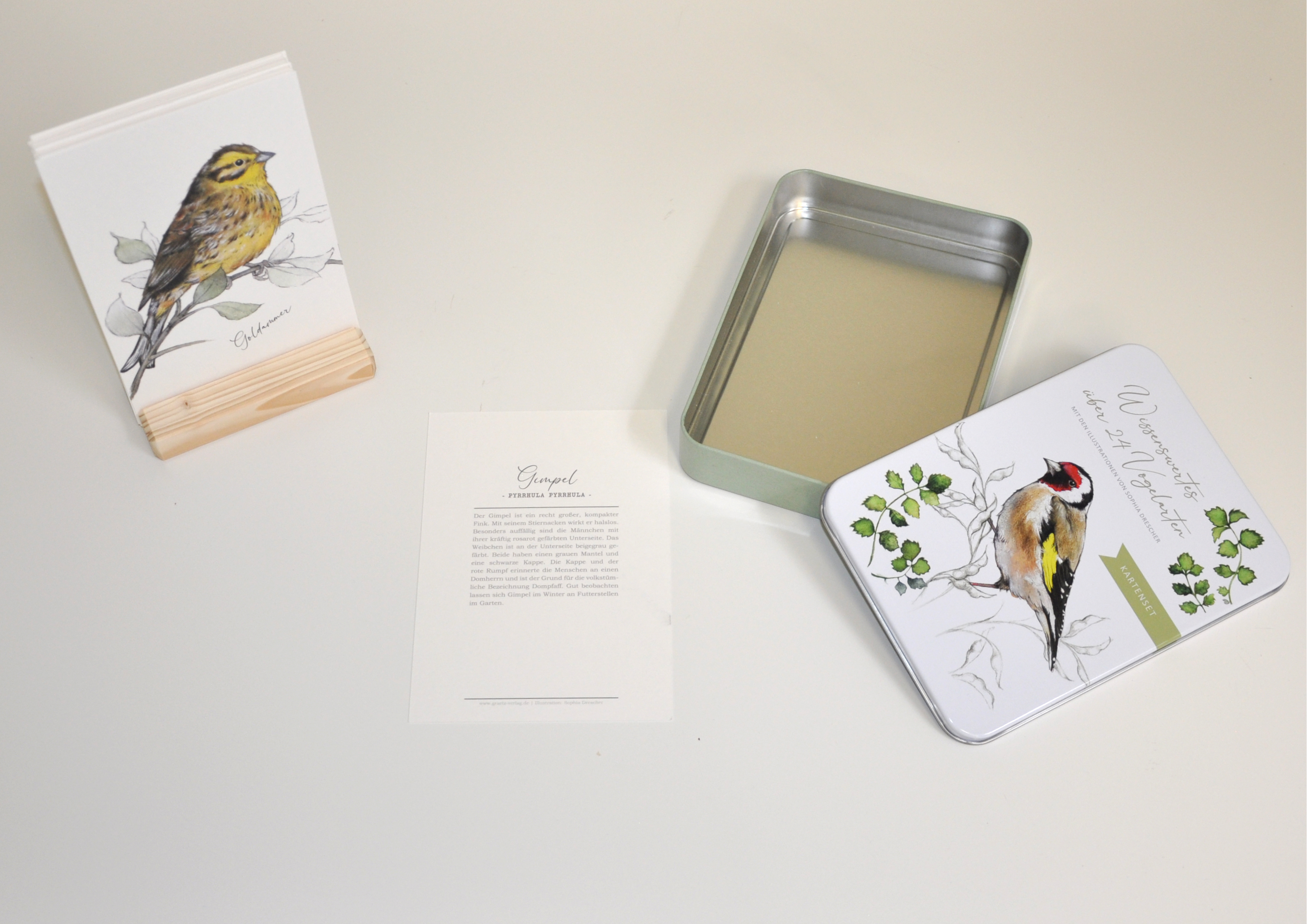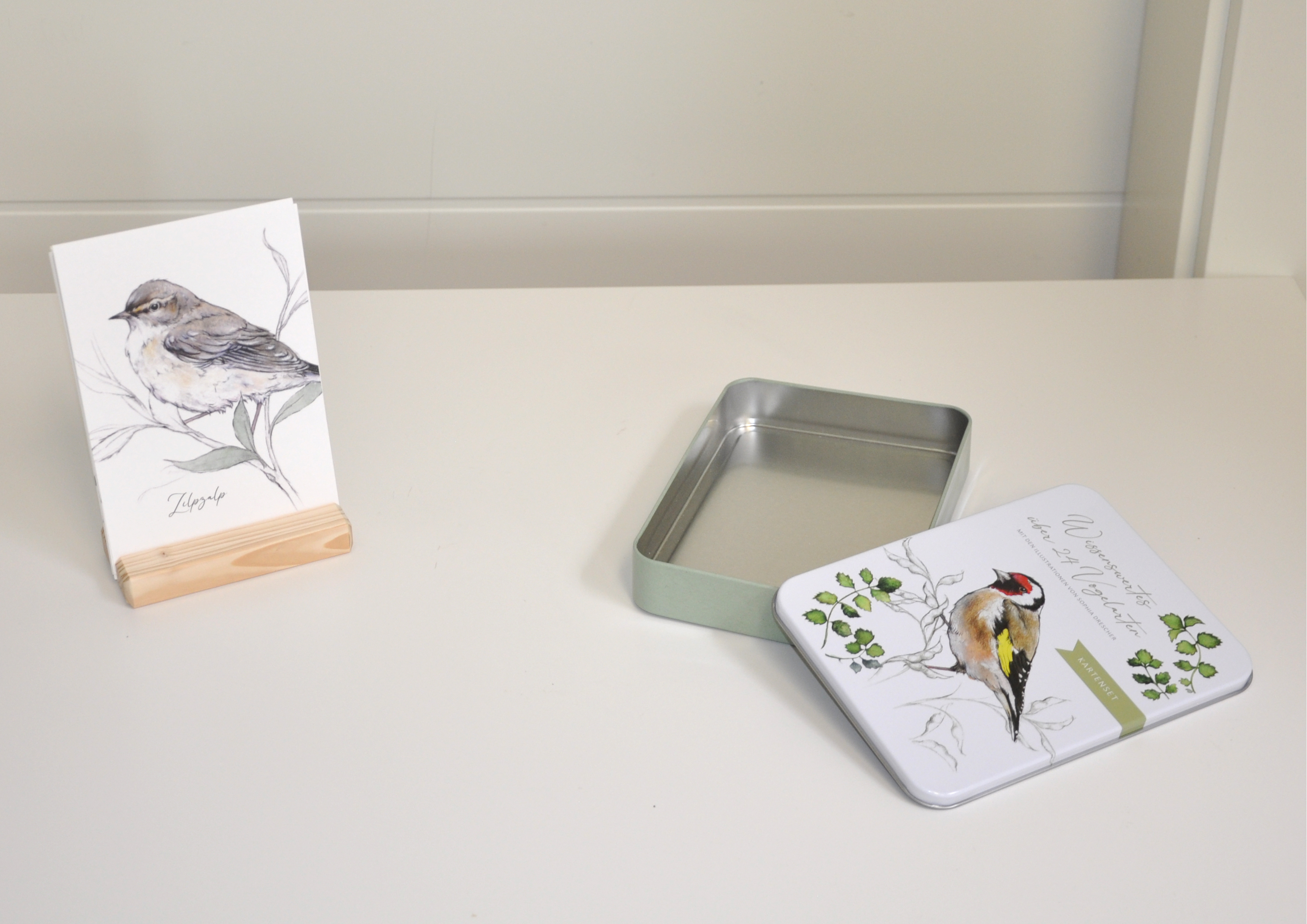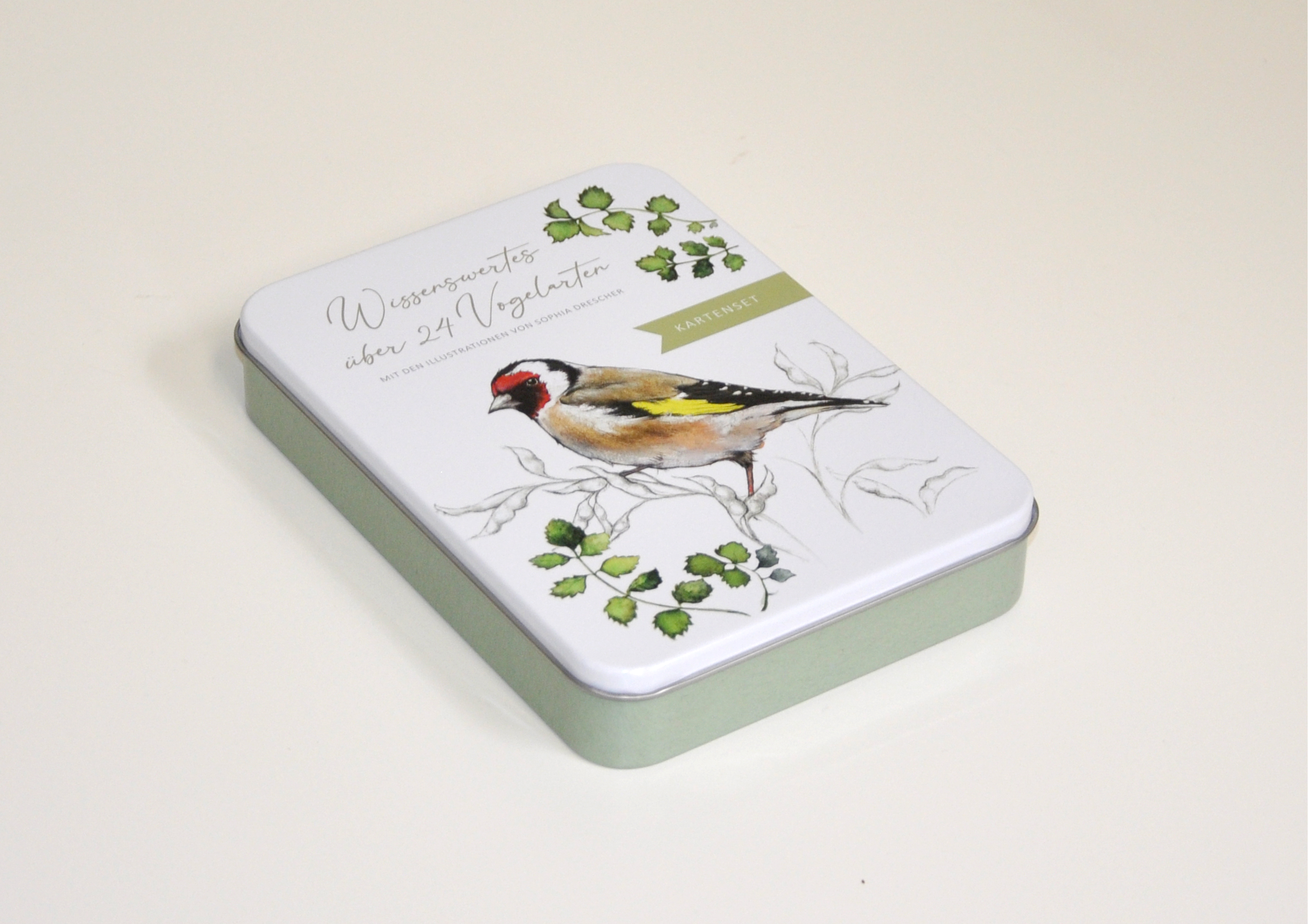 Diese Dose enhält Infokarten über heimische Vögel. Nicht