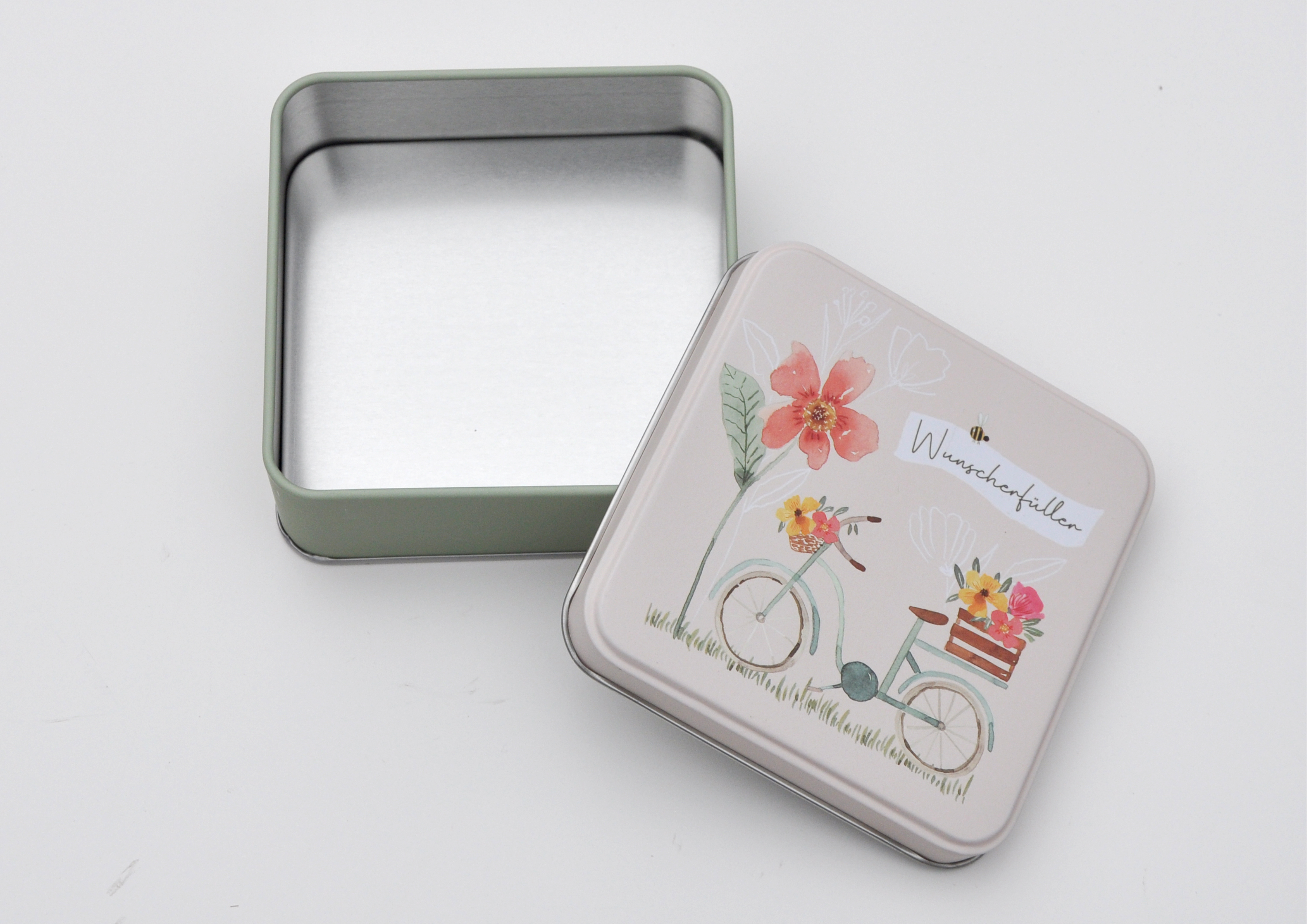 Ein Fahrrad voller Blumen. Mit der Aufschrift "Wunscherfüller" ist die Dose für viele verschiedene Anlässe geeignet.
