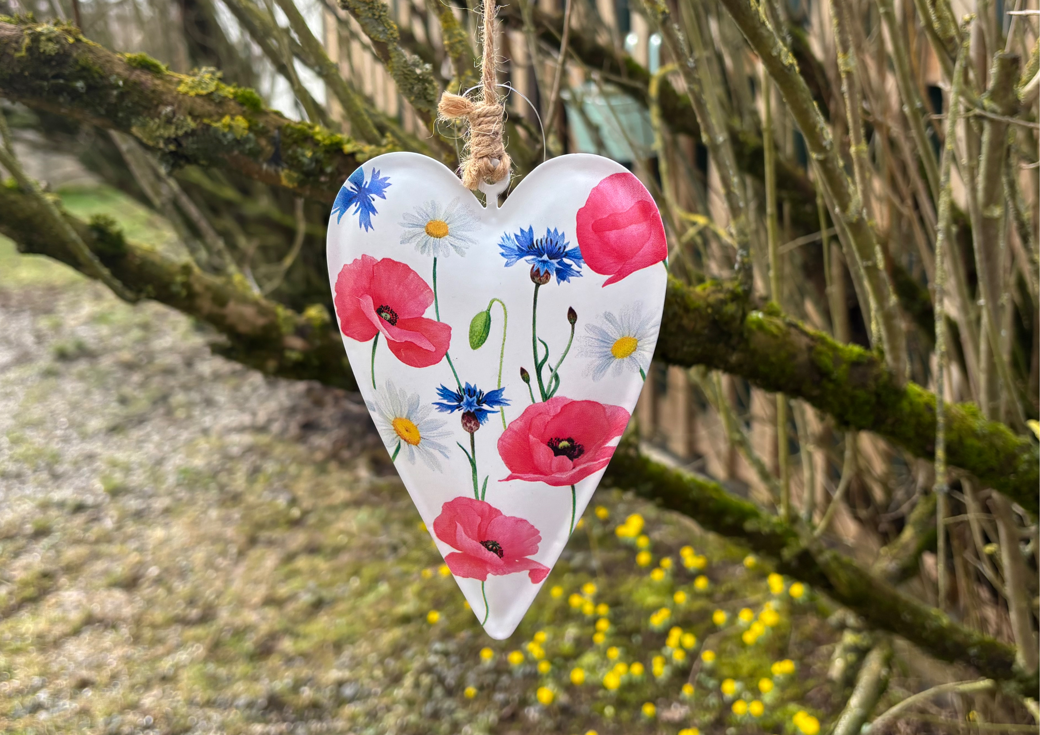 Farbenfrohes Dekoherz. Auf den ersten Blick stechen besonders die Mohnblumen ins Auge. Aber auch Kornblumen und Mageriten dürfen nicht fehlen.