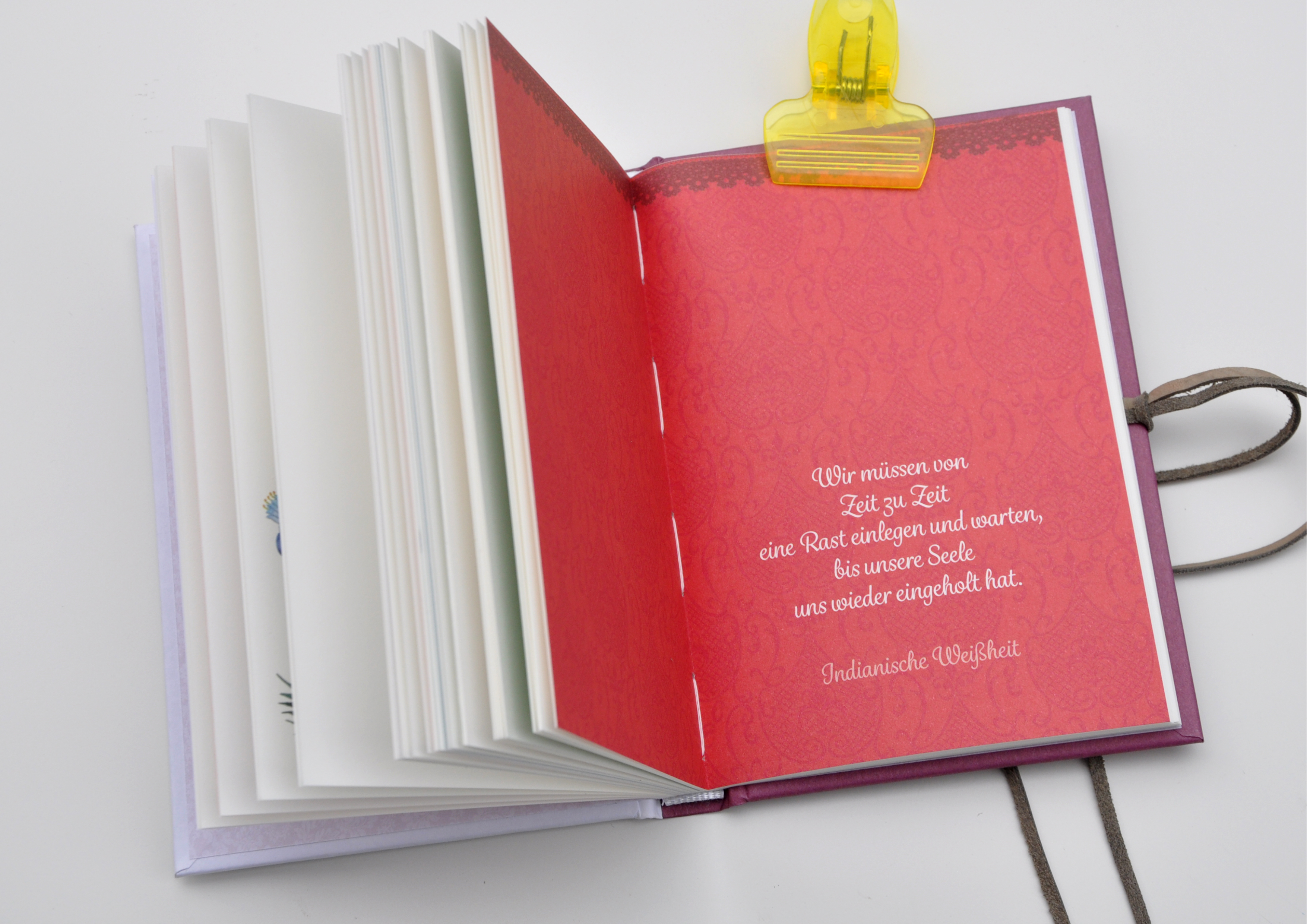 Dieses Buch passt in jede Handtasche. Mit einem Lederband wird das Büchlein verschlossen.