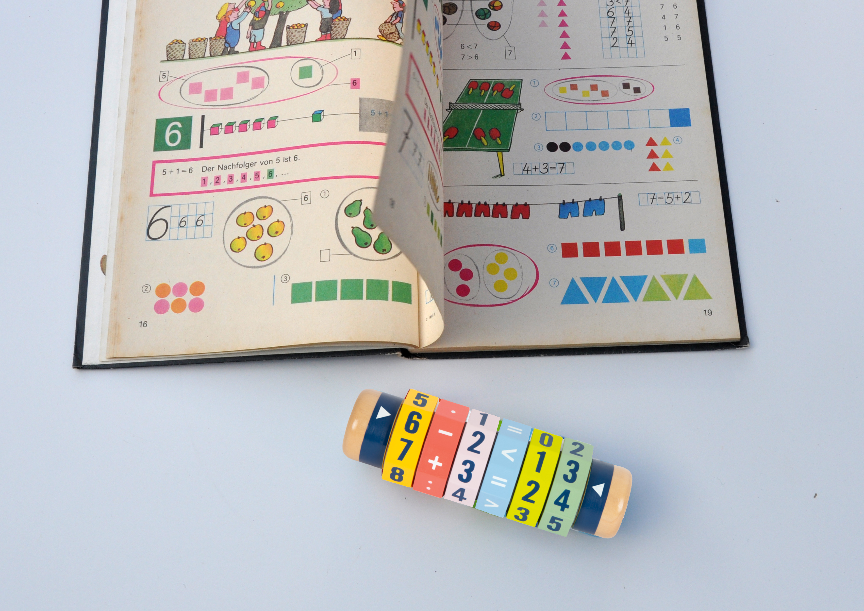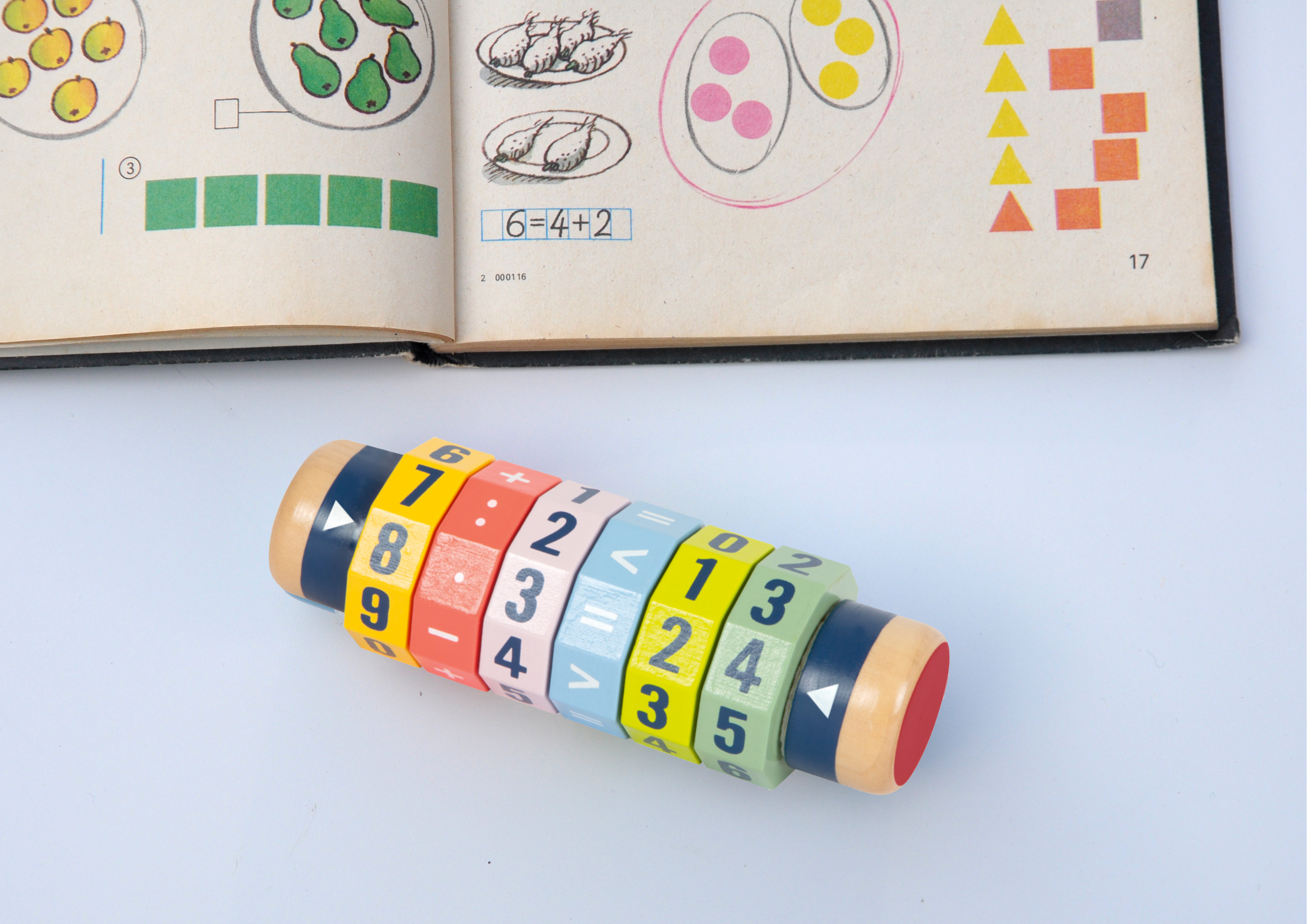 Mit sechs Drehelementen kann man addieren, subtrahieren, multiplizieren und dividieren. Durch den Drehmechanismus können immer wieder neue Rechenaufgaben gestellt werden.