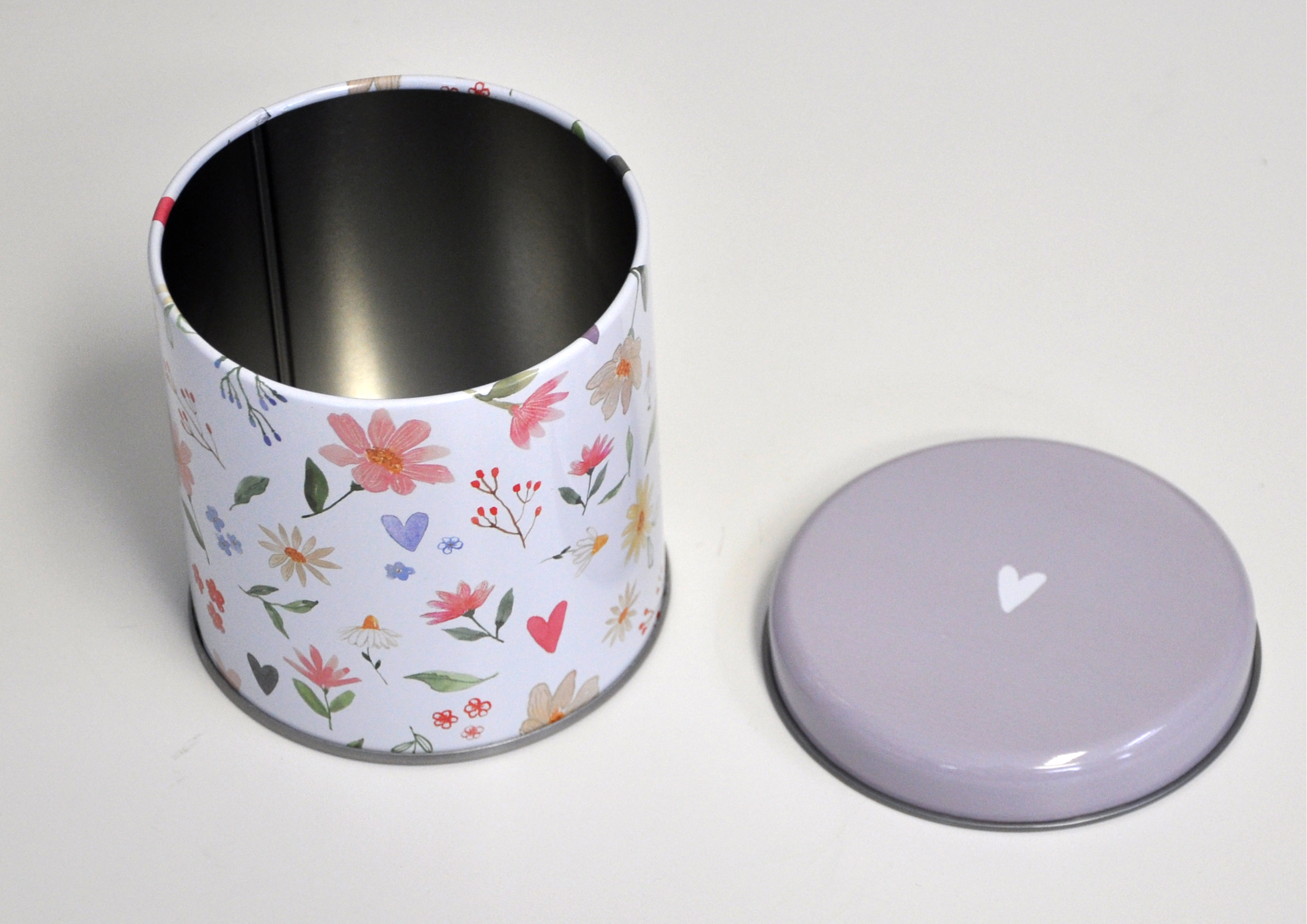 Zarte Blumen und Herzen schmücken diese Dose.