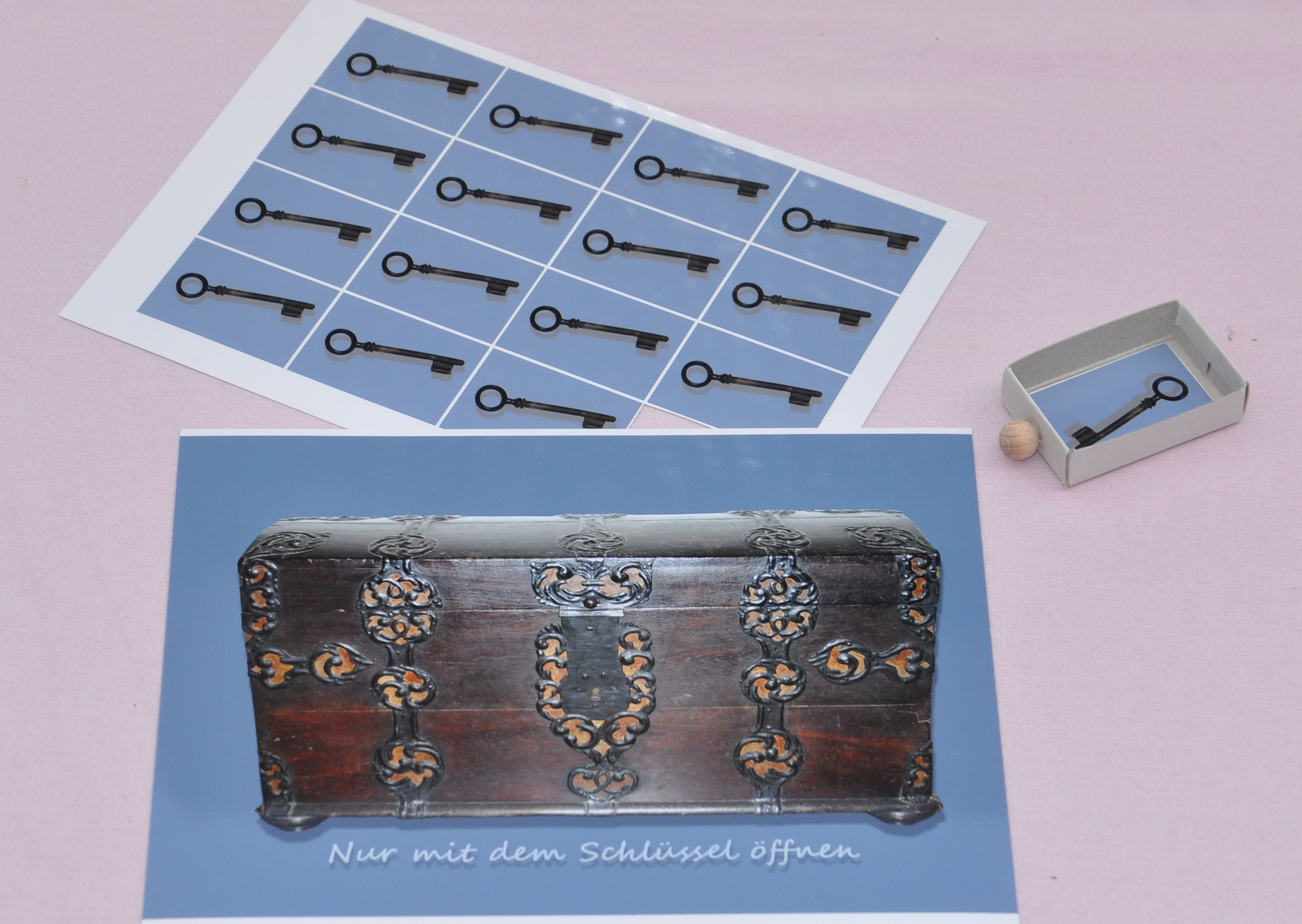 Einfach einen Karton (Schuhkarton oder ähnliches) mit Farbe bestreichen oder mit Geschenkpapier bekleben und das Foto der Truhe aufkleben. Die Schlüssel ausschneiden und in das jeweilige Kästchen legen.