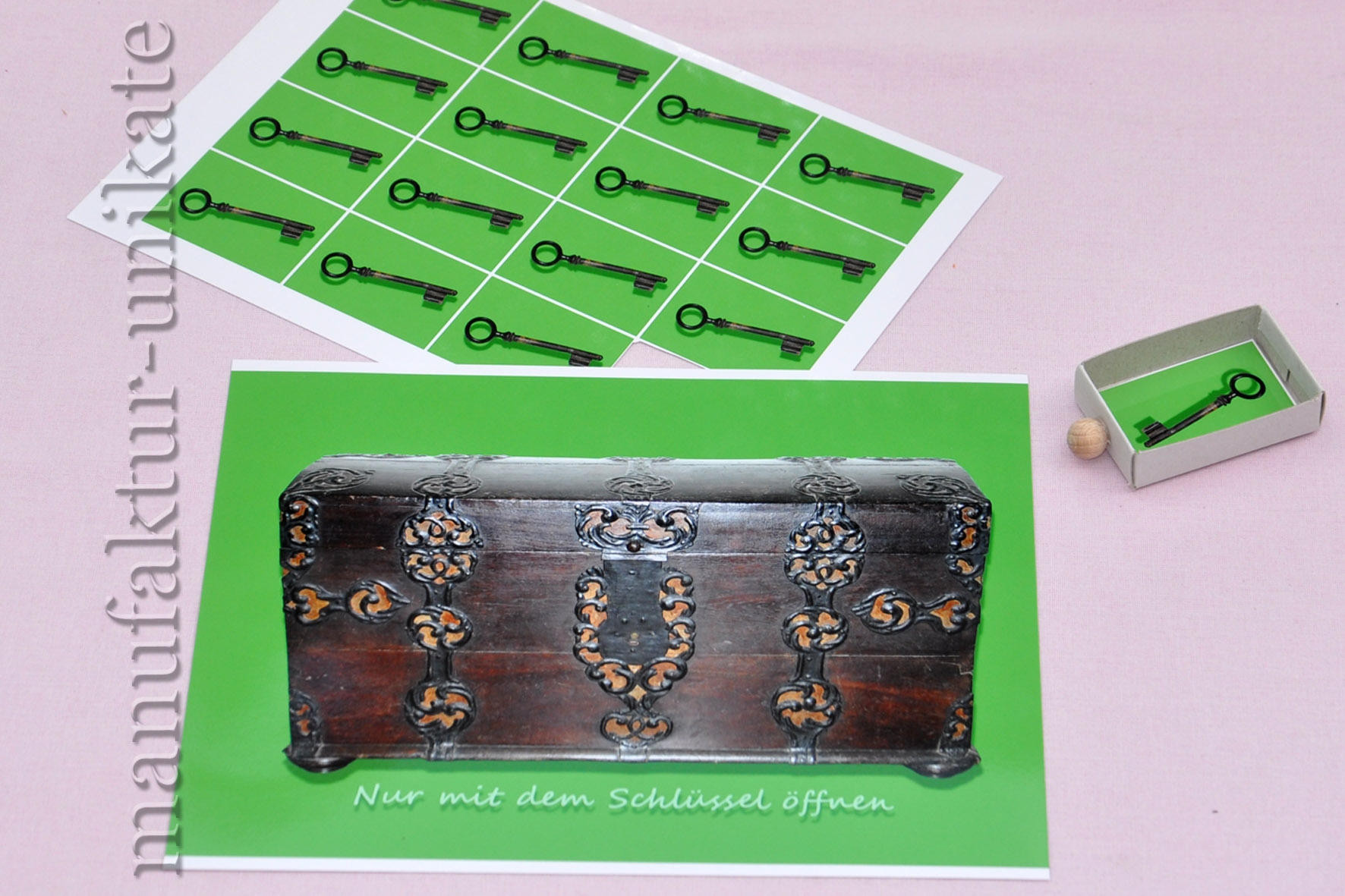 Einfach einen Karton (Schuhkarton oder ähnliches) mit Farbe bestreichen oder mit Geschenkpapier bekleben und das Foto der Truhe aufkleben. Die Schlüssel ausschneiden und in das jeweilige Kästchen legen.