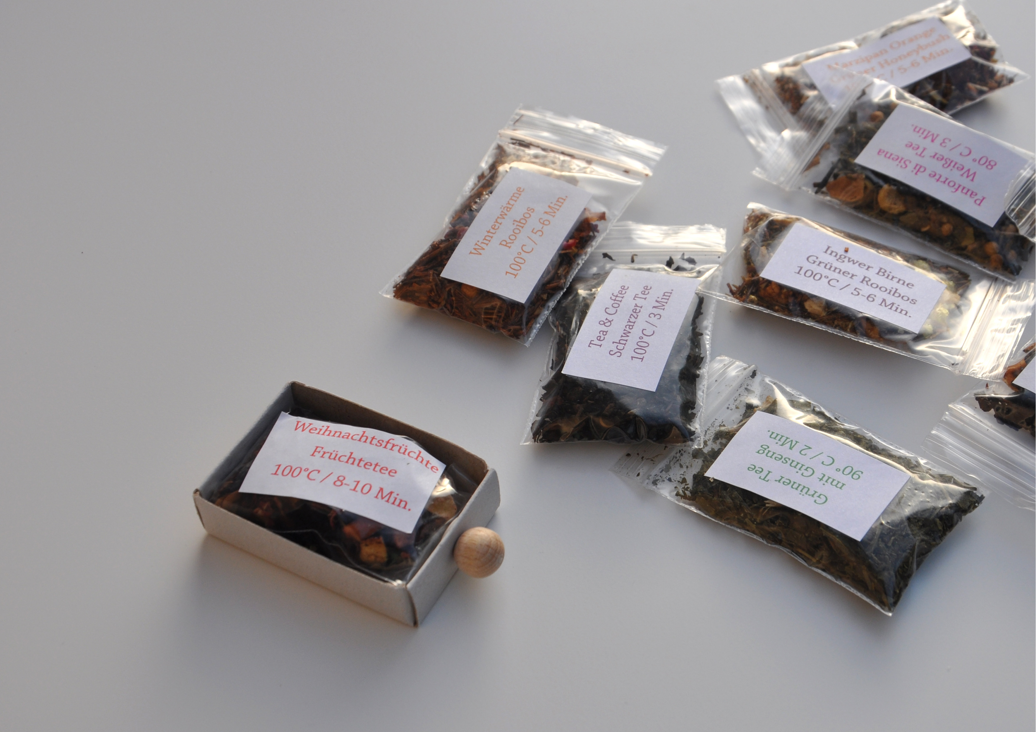 24 Sorten – keine ist doppelt. Der Tee ist portionsweise, in Druckverschlussbeuteln, verpackt und mit folgenden Informationen versehen: Name des Tees, MHD, Sorte und Hinweis zur Aufbrühtemperatur und Ziehzeit.