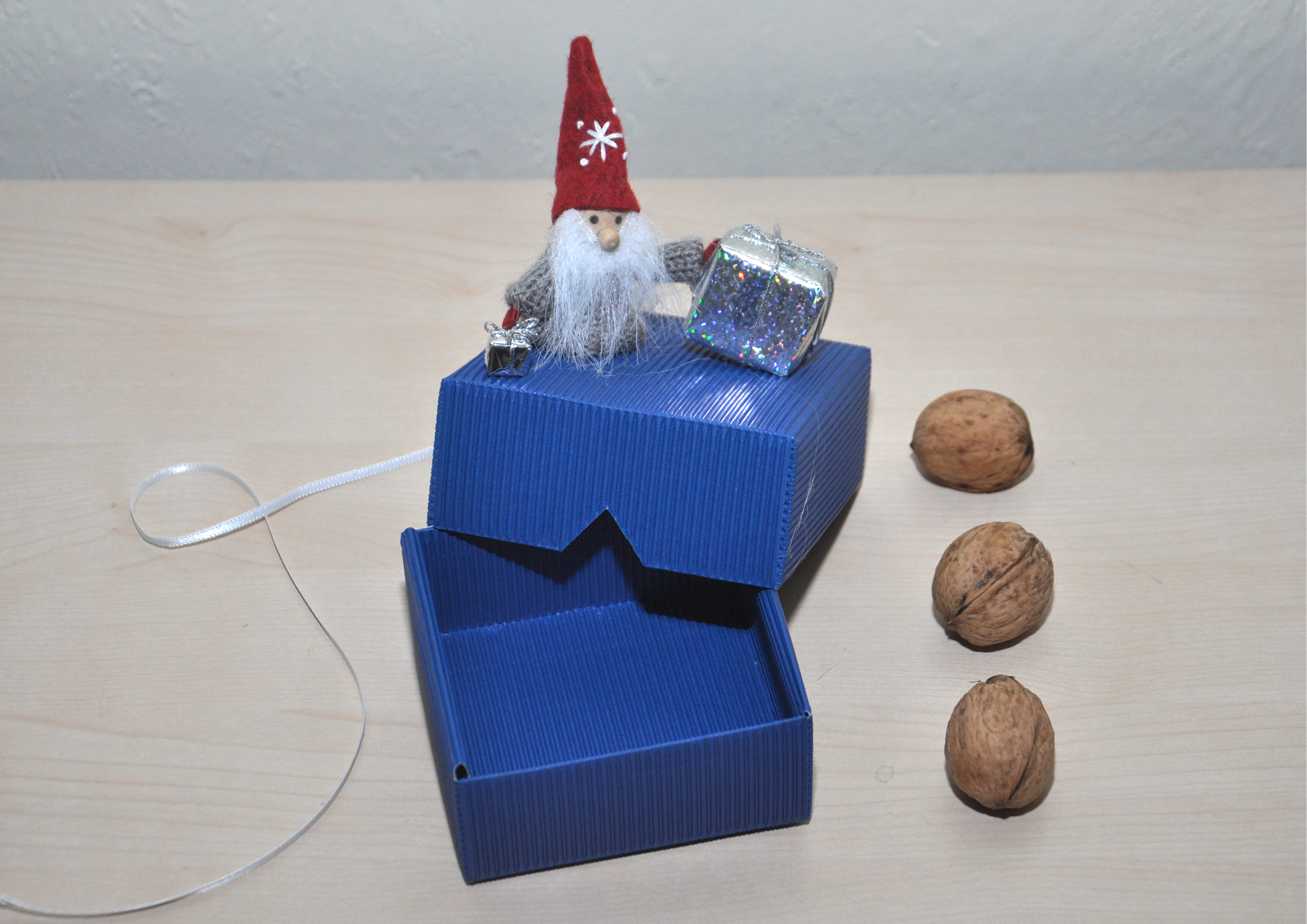 Geschenkbox aus Wellpappe BLAU - Kobold mit Paket