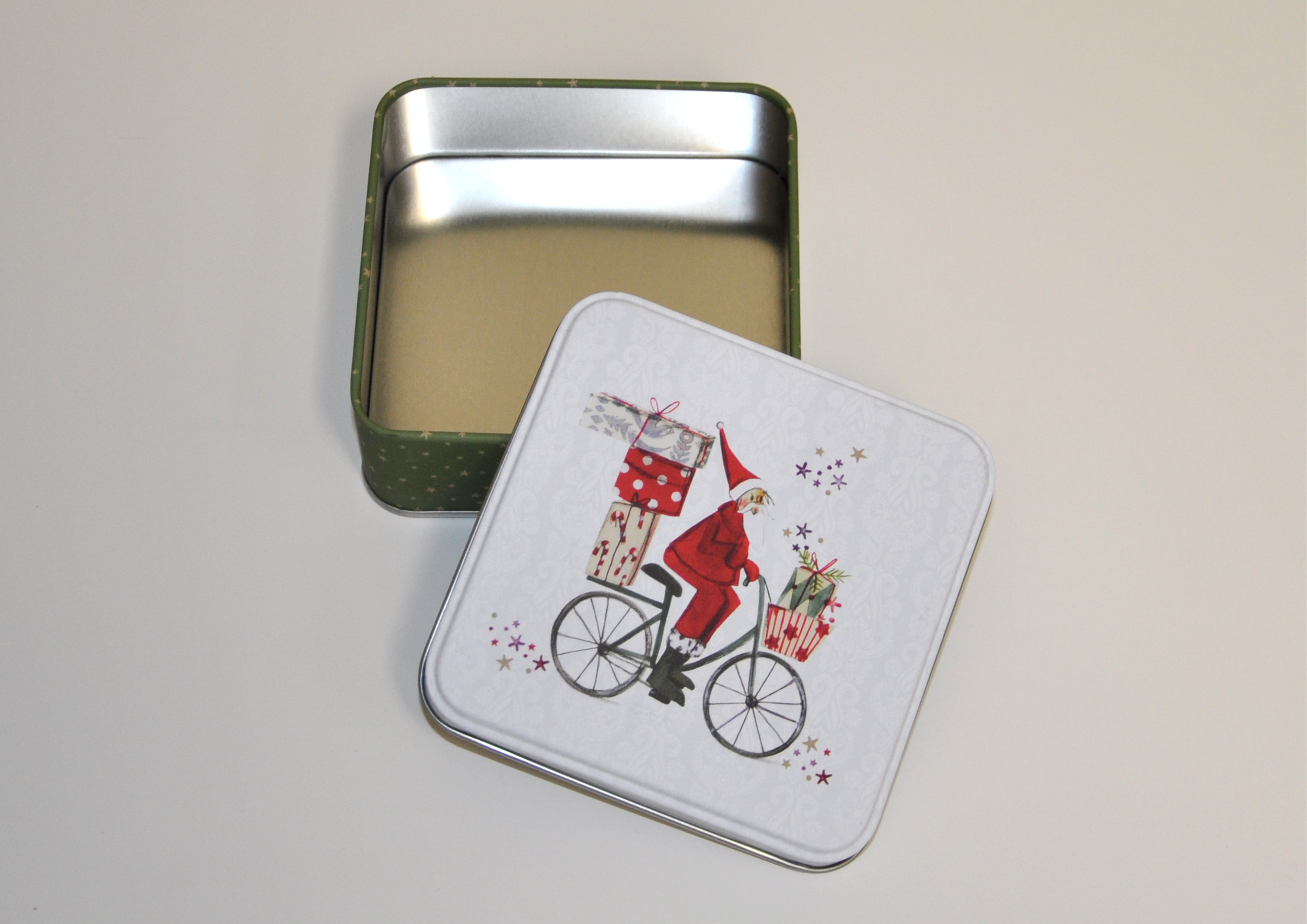 Weihnachtsmann auf dem Fahrrad - Geschenkdose aus Metall