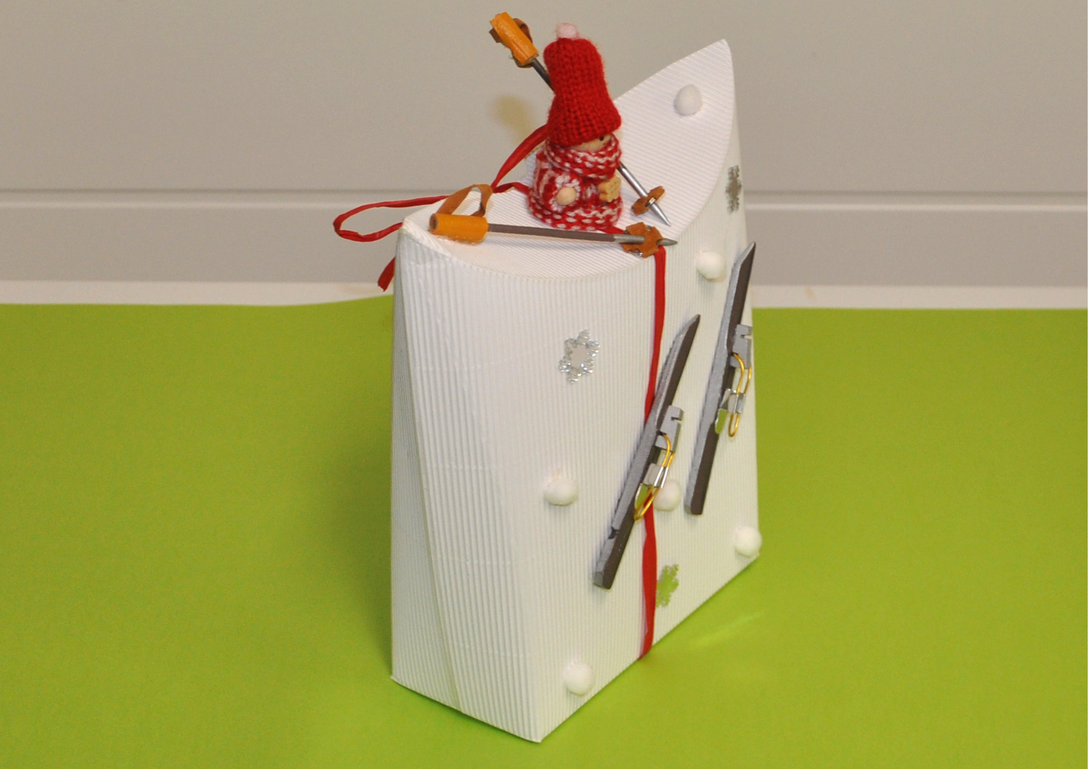 Der kleine Wichtel bewacht einen Gutschein oder ein Geldgeschenk oder auch kleine Geschenke für einen Skiurlaub oder einen Ausflug zum Skikfahren. Euch fällt sicher einiges ein, was ihr in dieser hübschen Box verpacken könnt. Wir haben sie aus weißer Wellpappe gefertigt