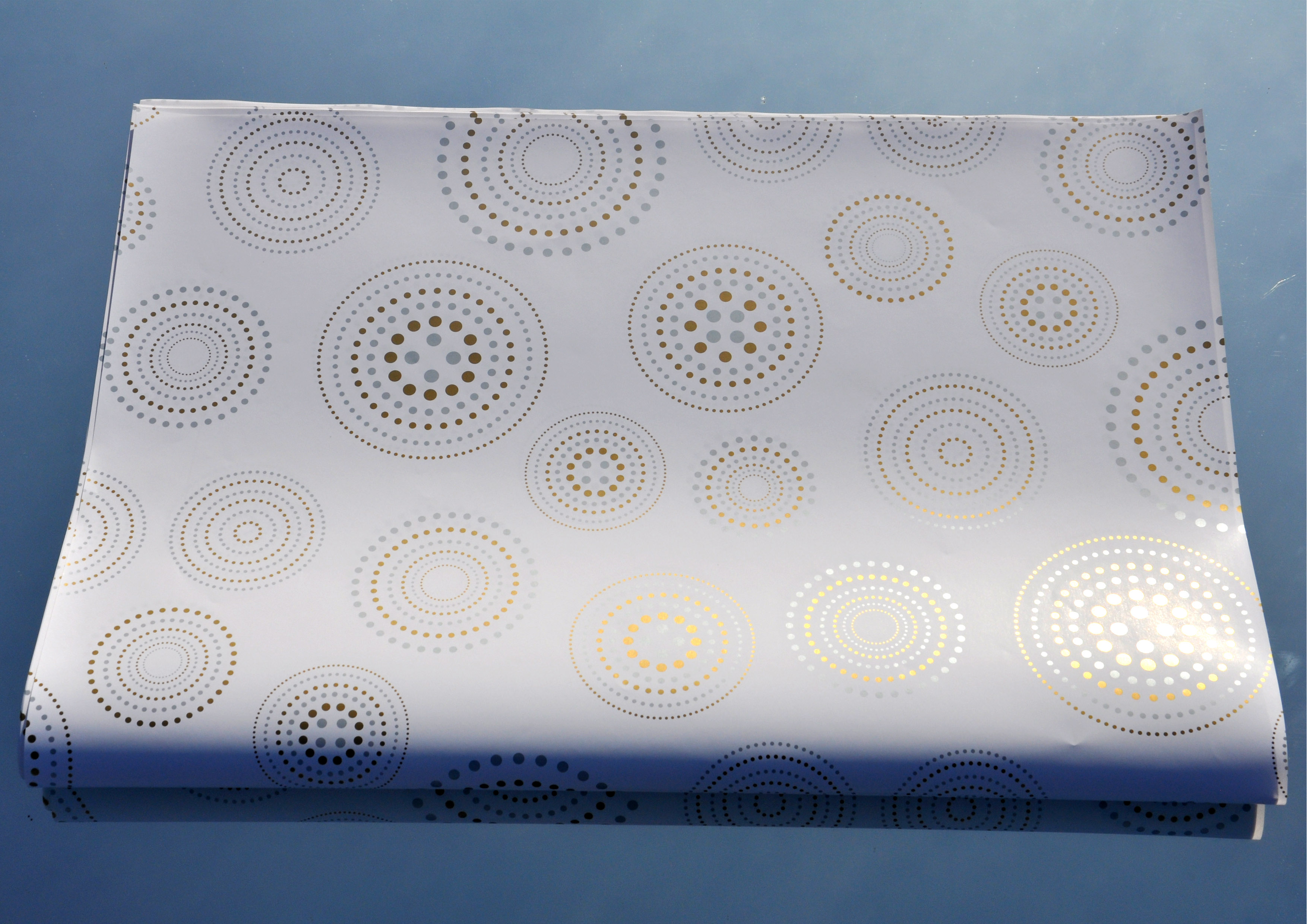Schlichtes Geschenkpapier. Auf weißem Grund findet man Kreise, die je nach Lichteinfall, silber und goldig gläzen. Deshalb sehr gut geeignet für die Silberne oder Goldene Hochzeit.