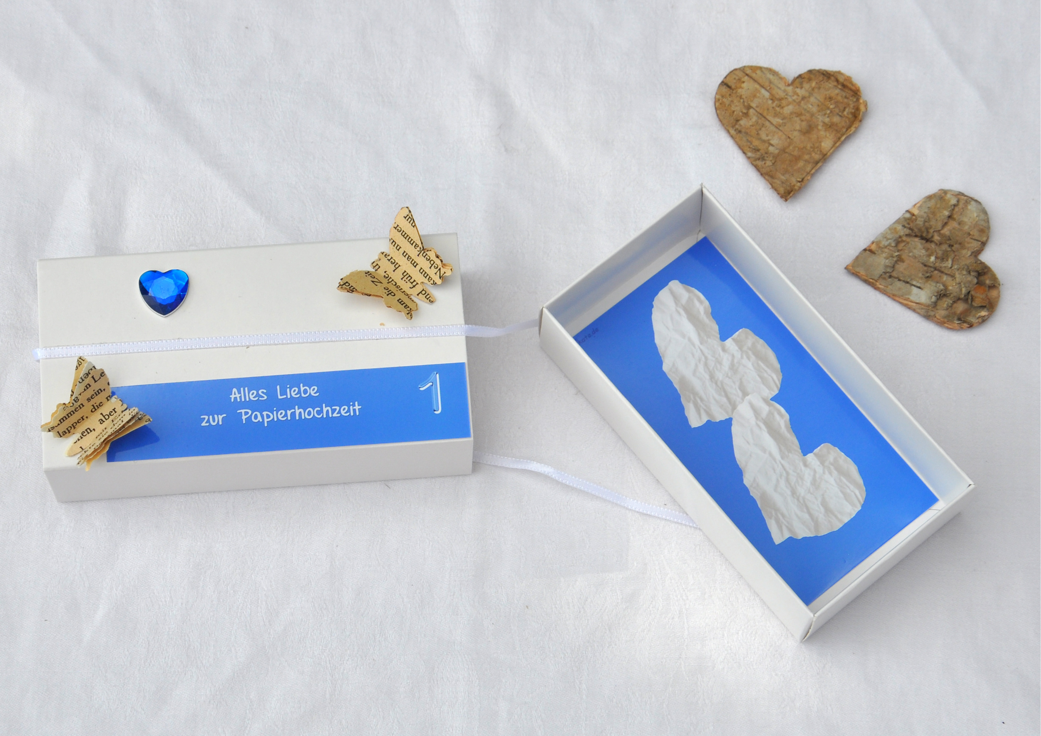 1. Hochzeitstag Papierhochzeit - Geschenkschachtel weiß / hellblau 1 Herz