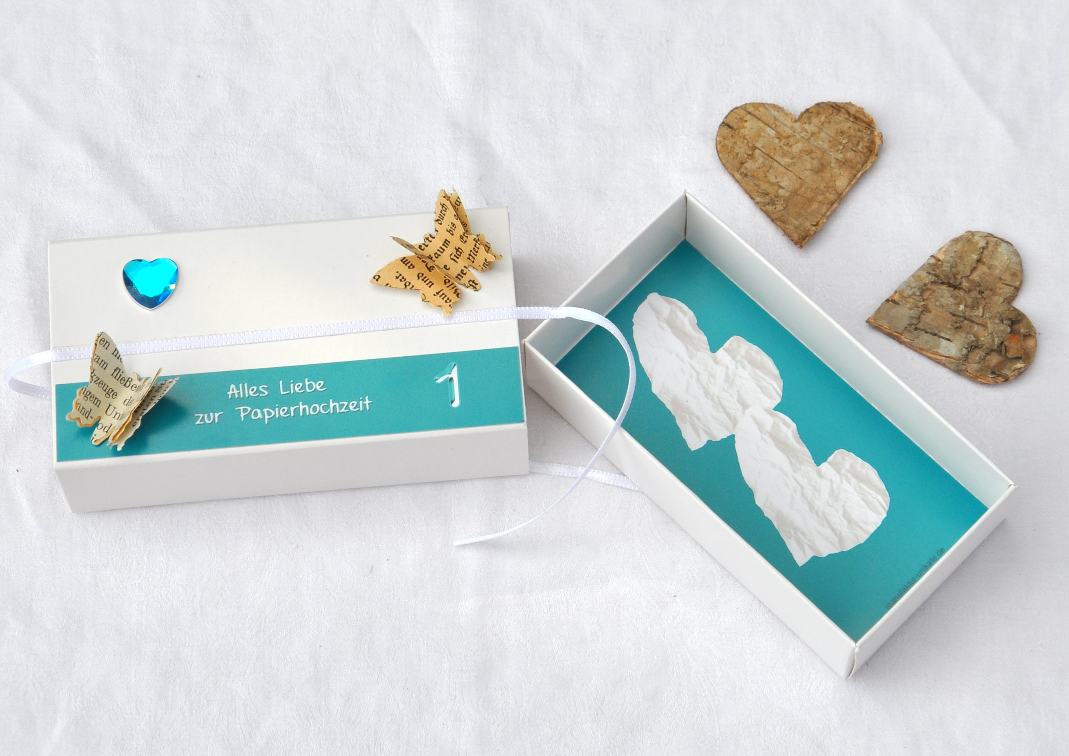 In dieser schönen Schachtel findet ein kleines Geschenk Platz. Zum Beispiel ein Gutschein, ein Schmuckstück, die Lieblingssüßigkeit, ein Geldgeschenk oder auch kleine Erinnerungen aus dem 1. Ehejahr.