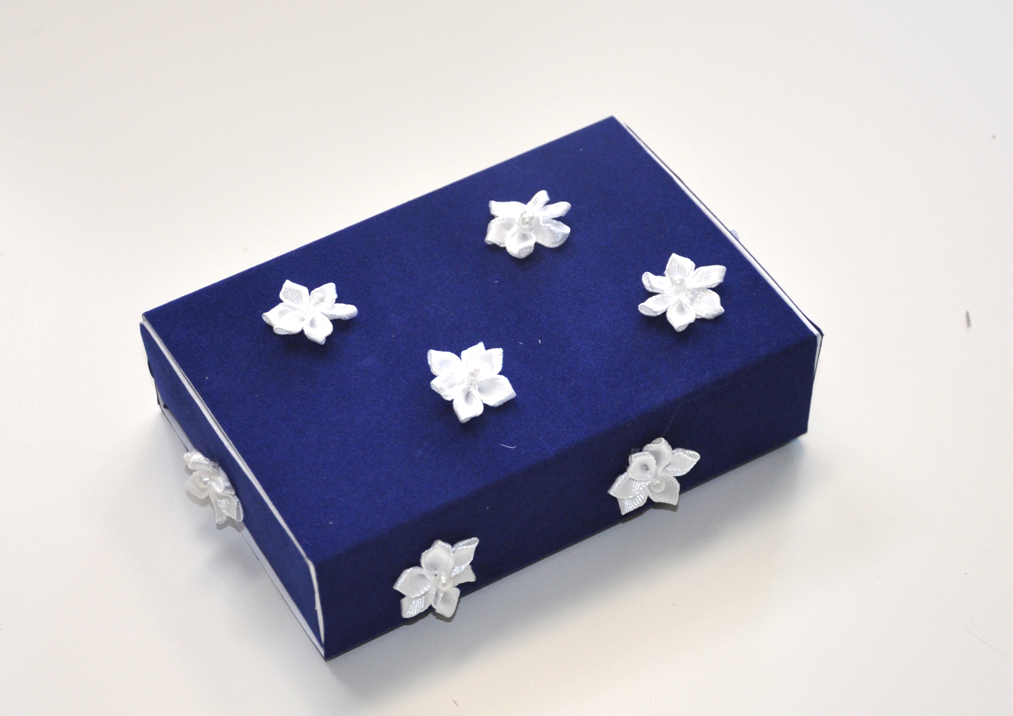 Die Schachtel aus blauem Samtpapier wirkt besonders edel, darauf strahlen weiße Blüten mit jeweils einer Perle in der Mitte.