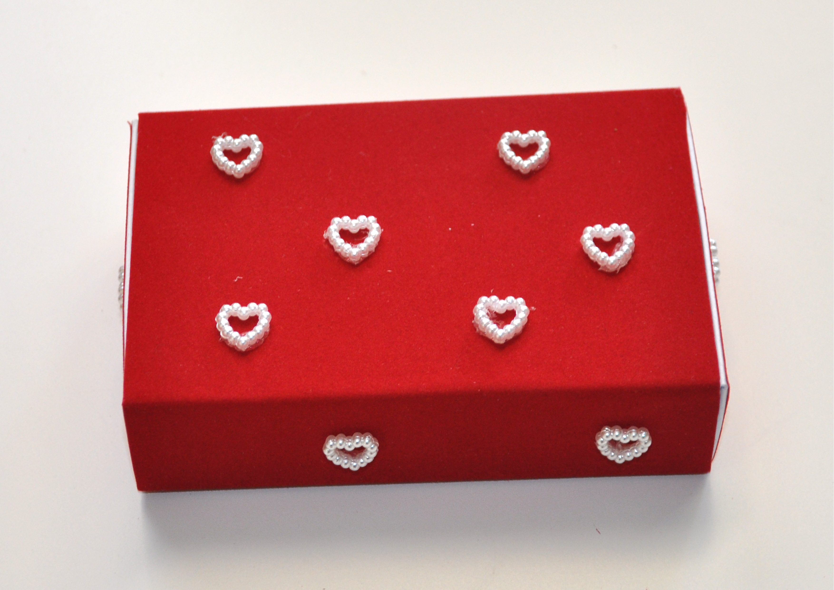Die Schachtel aus rotem Samtpapier wirkt besonders edel, darauf strahlen kleine Perlenherzen.