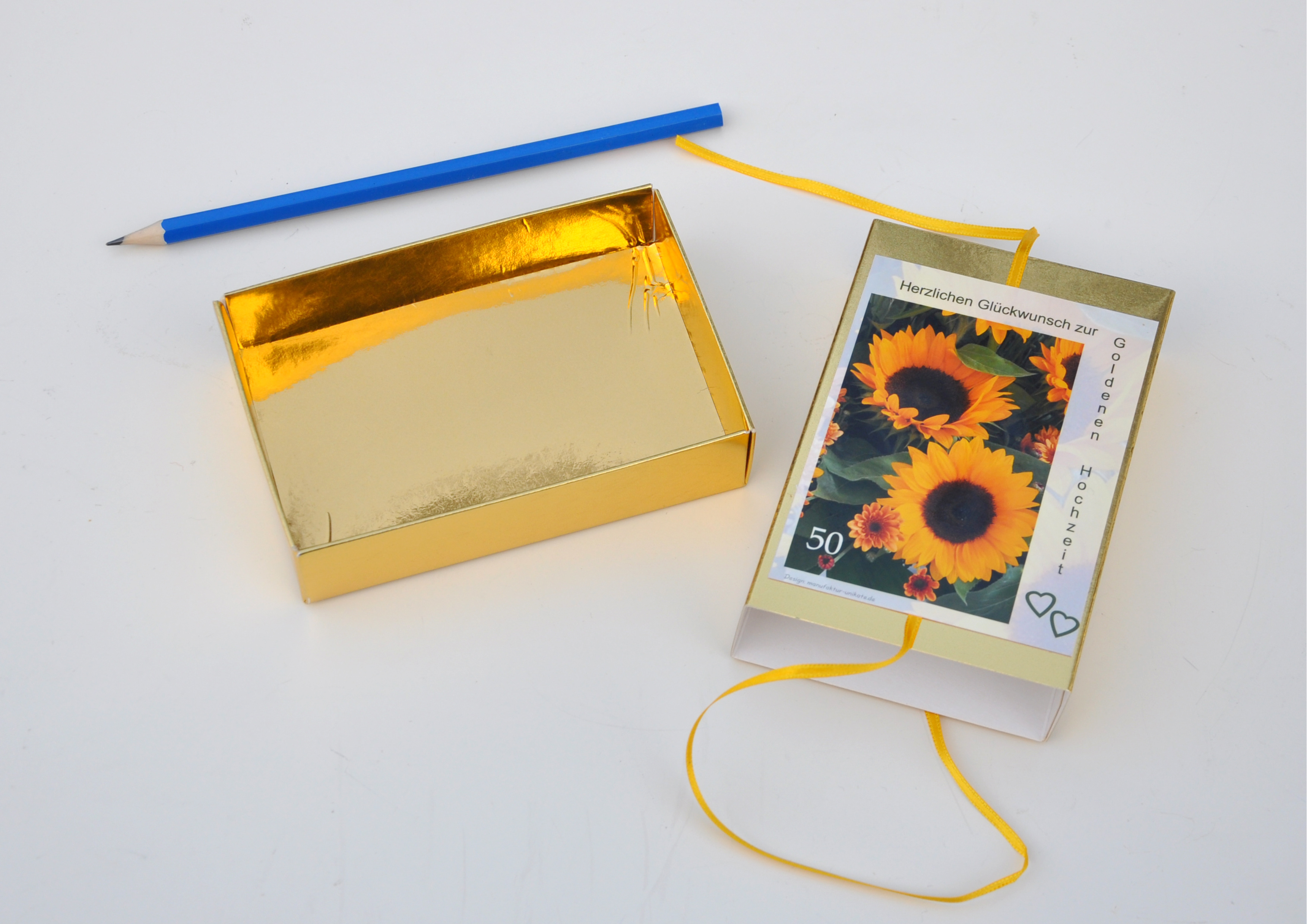 Goldene Geschenkschachtel zum 50. Hochzeitstag - der "Goldenen Hochzeit".