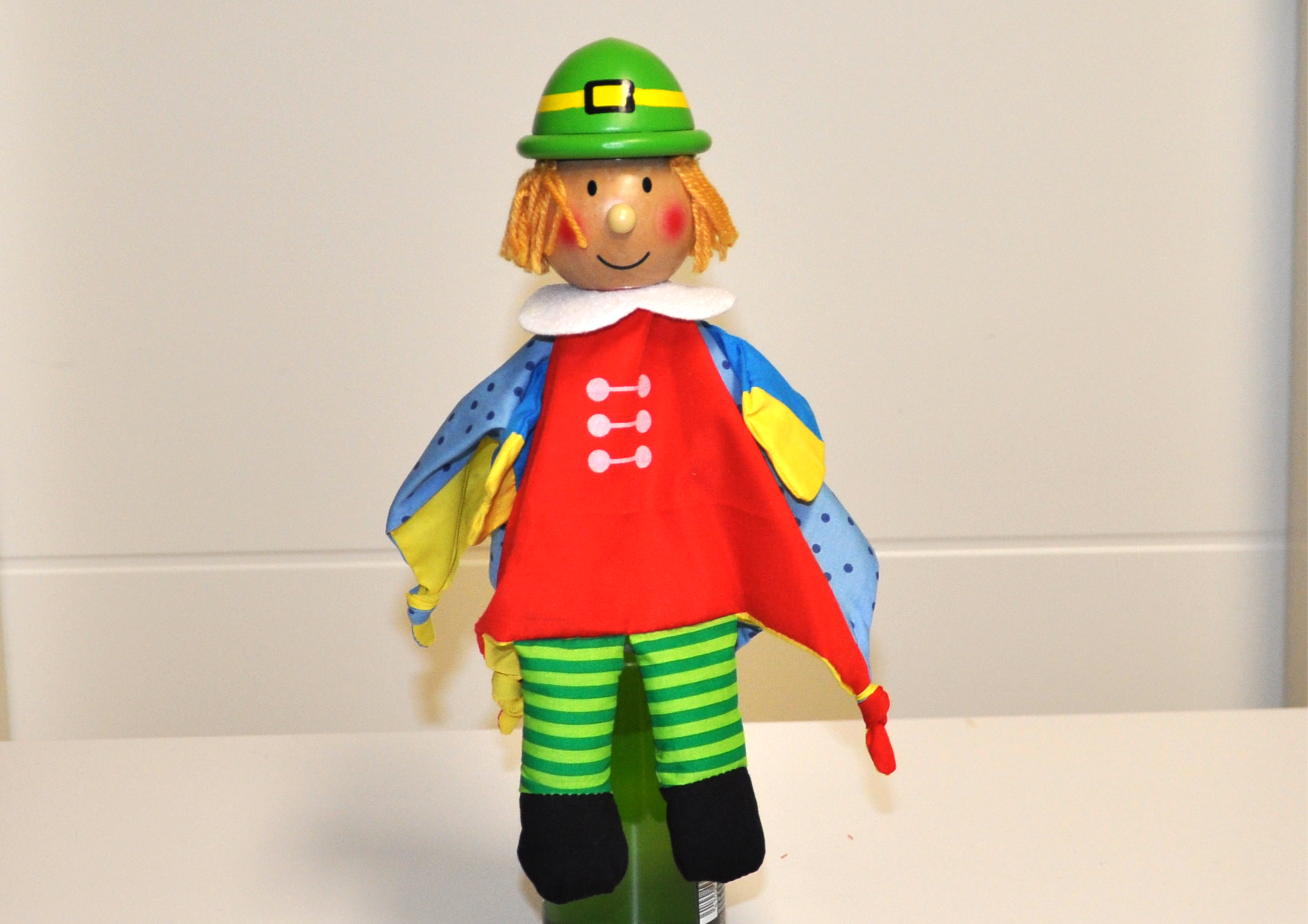 Der Kopf dieser Figur ist aus Holz. Dieser kann zusammen mit den Armen, durch die richtige Fingerhaltung, bespielt werden.