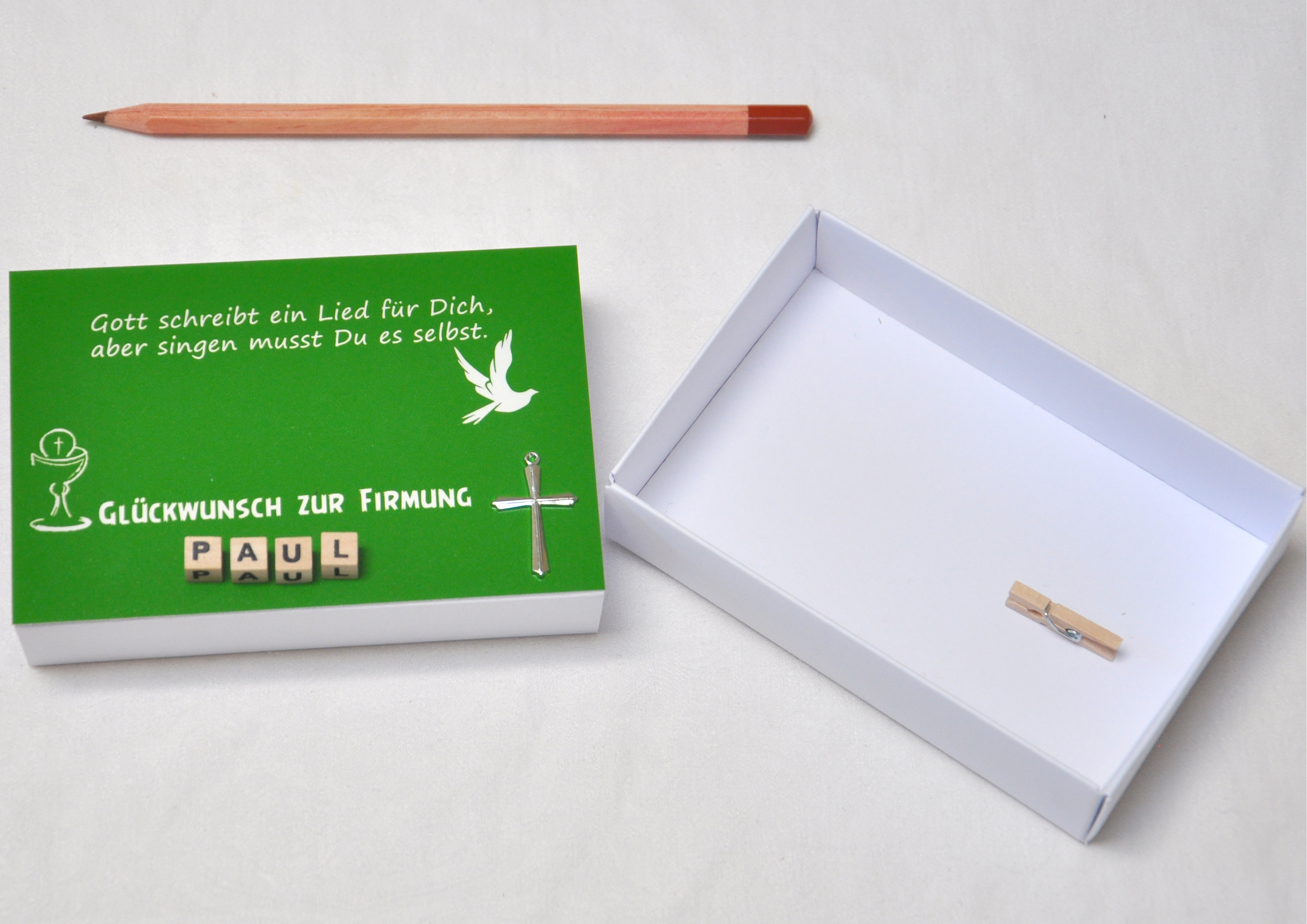 Geschenkverpackung zur Firmung, verschiedene Farben zur Auswahl. Die Farben können, je nach Bildschirmeinstellung, etwas abweichen.