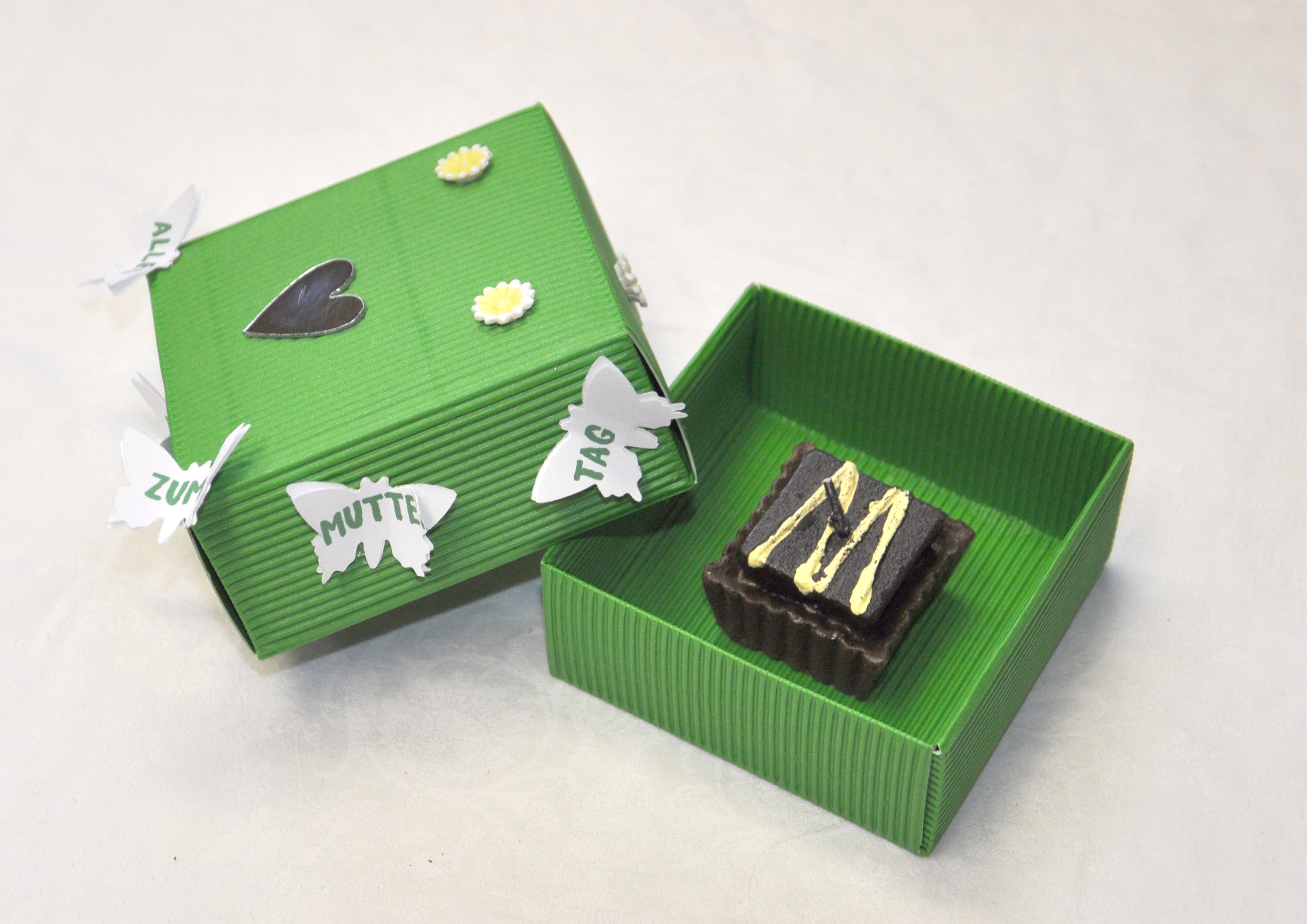 Die Schachtel haben wir aus Wellpappe gefertigt. Die Schmetterlinge bringen liebe Grüße für die Mama.