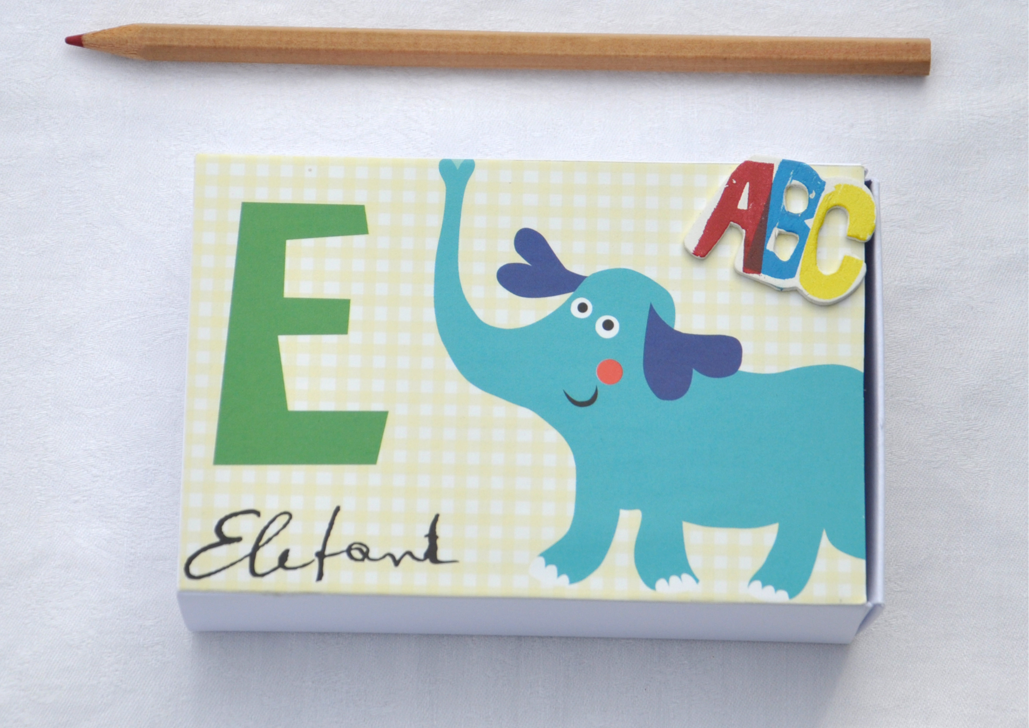 Hier geht es um das E wie Elefant. In der Schachtel befindet sich eine Klammer mit einer kleinen Tafel, darauf kann noch der Name vom Kind geschrieben werden.