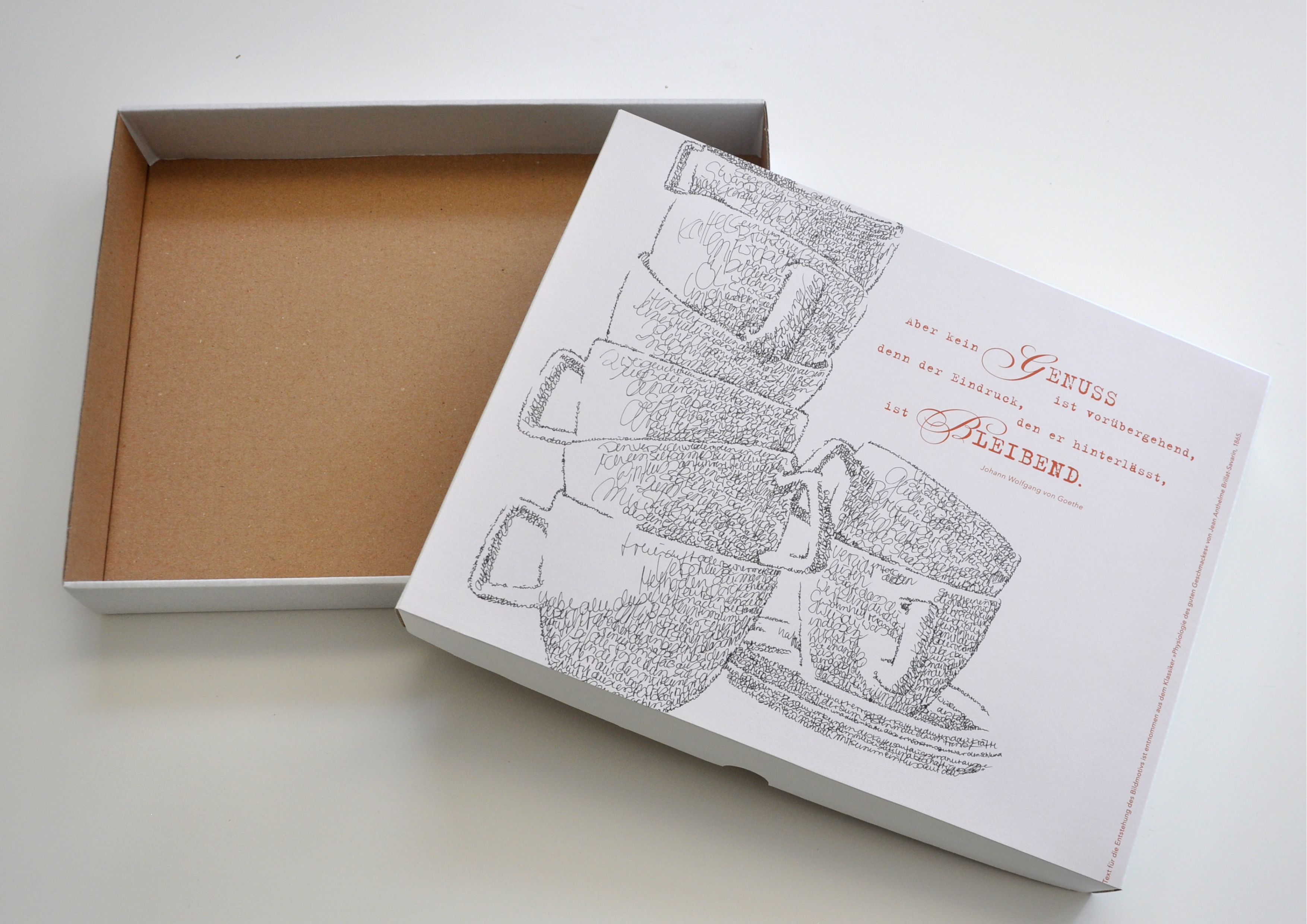 Produktinformationen "Kaffeetassen / Essen / Zitat Johnn Wolfgang von Goethe - Geschenkschachtel mit Deckel"
