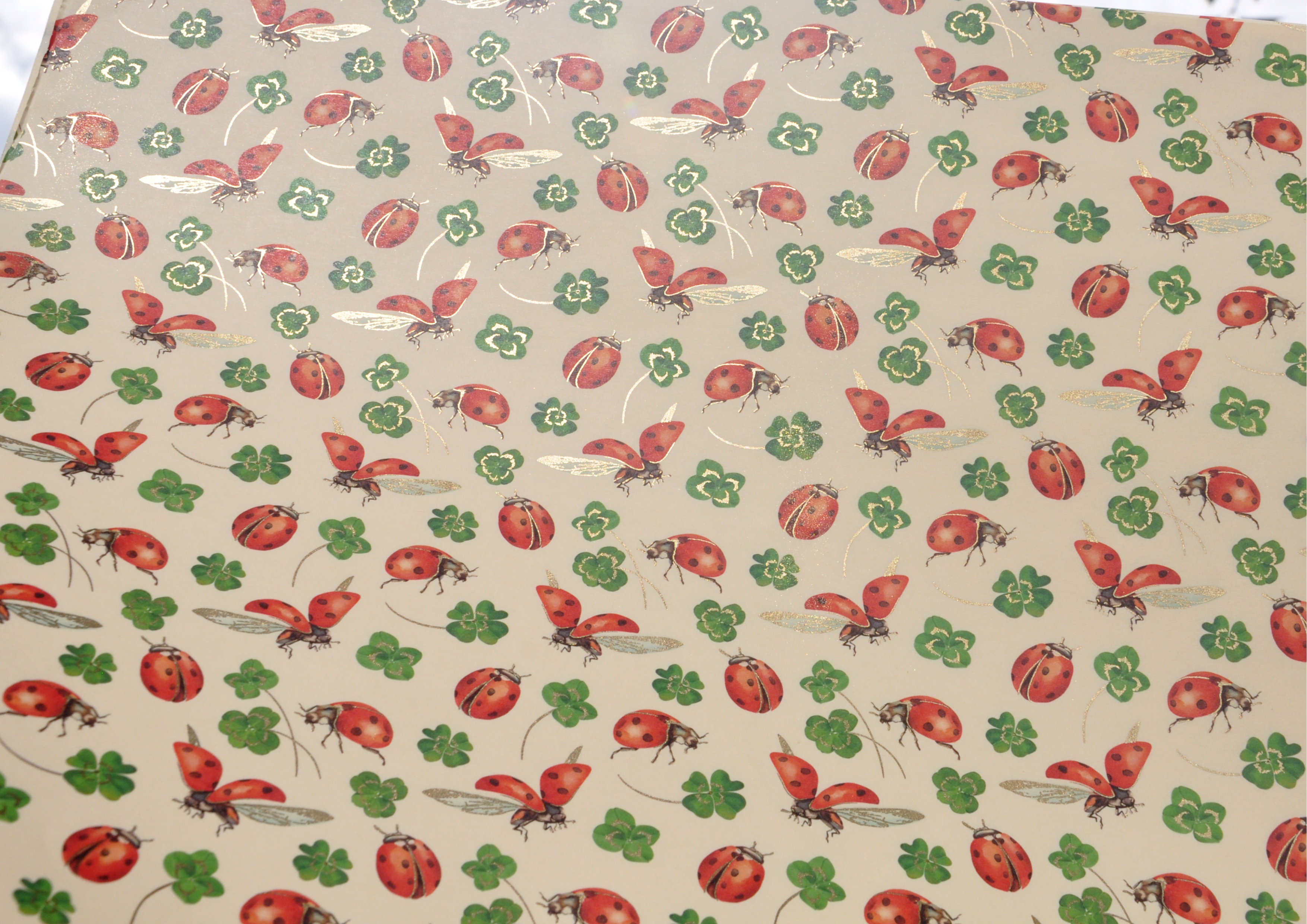 Viele kleine Marienkäfer krabbeln oder fliegen über dieses hochwertige Papier. Der partielle Golddruck verleiht dem Geschenkpapier eine besonders zauberhafte Ausstrahlung