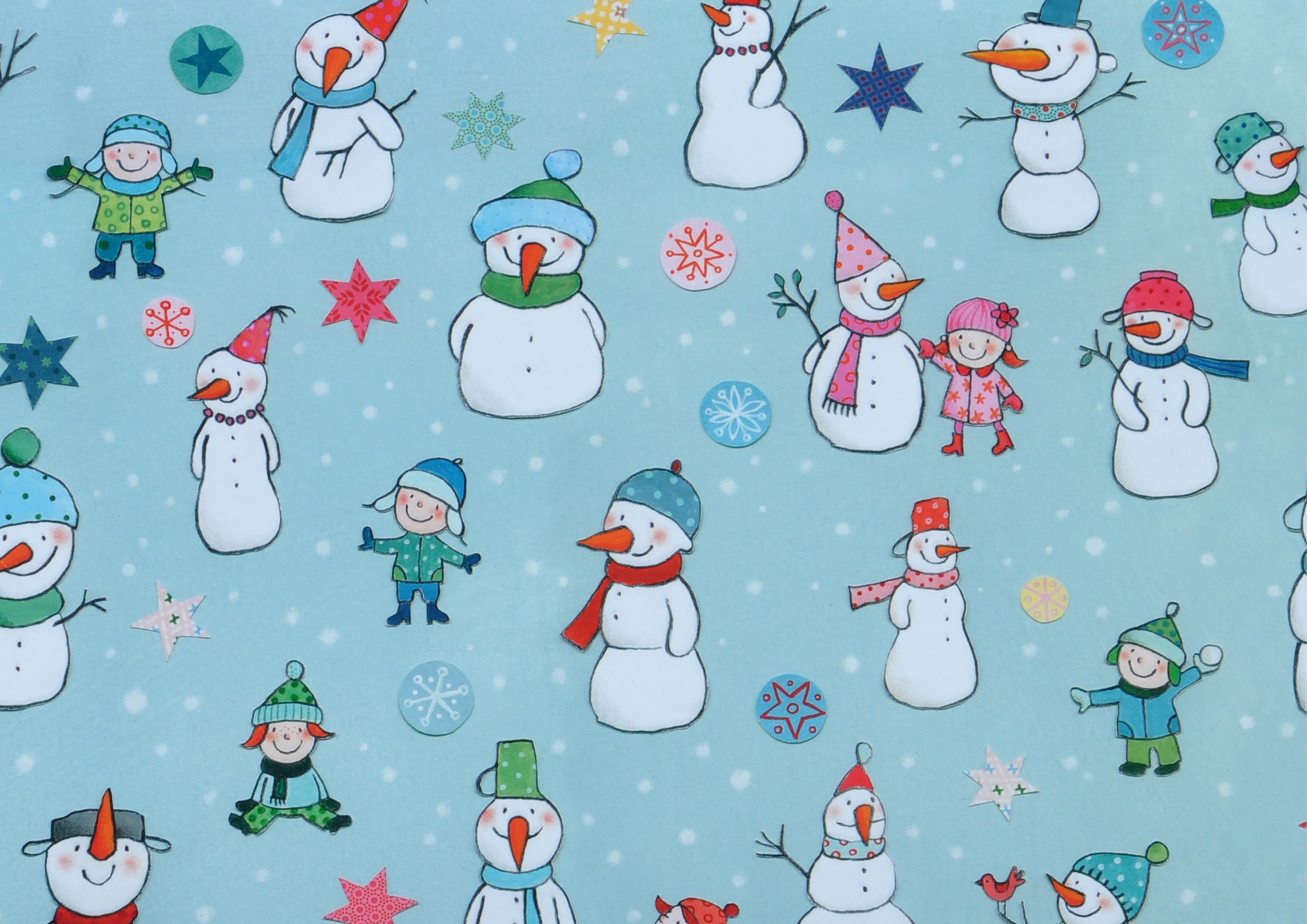 Viele lustige Schneemänner tummeln sich auf dem Geschenkpapierbogen.