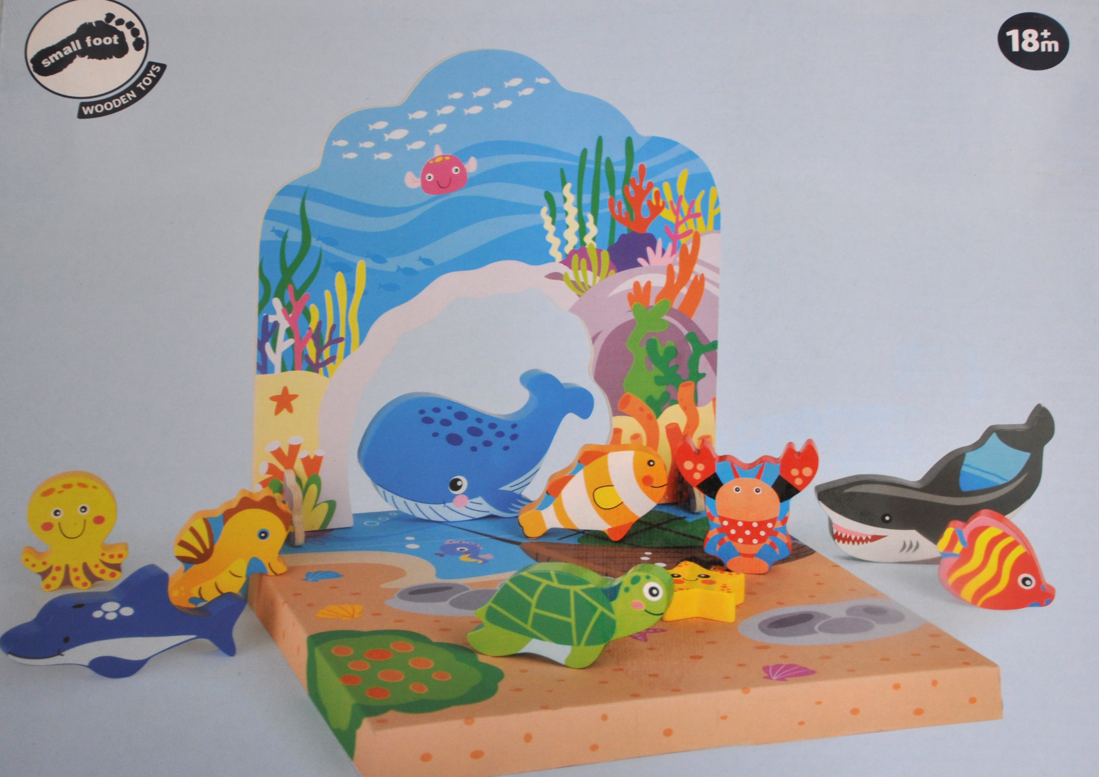 Wer kommt denn da vorbeigeschwommen? Mit dieser Spielwelt lassen sich aufregende Unterwasser-Abenteuer erleben! Der farbenfrohe Hintergrund aus Holz und die praktische Bodenpappe lassen die Kinder im Handumdrehen eintauchen in spannende Tiefseegeschichten.