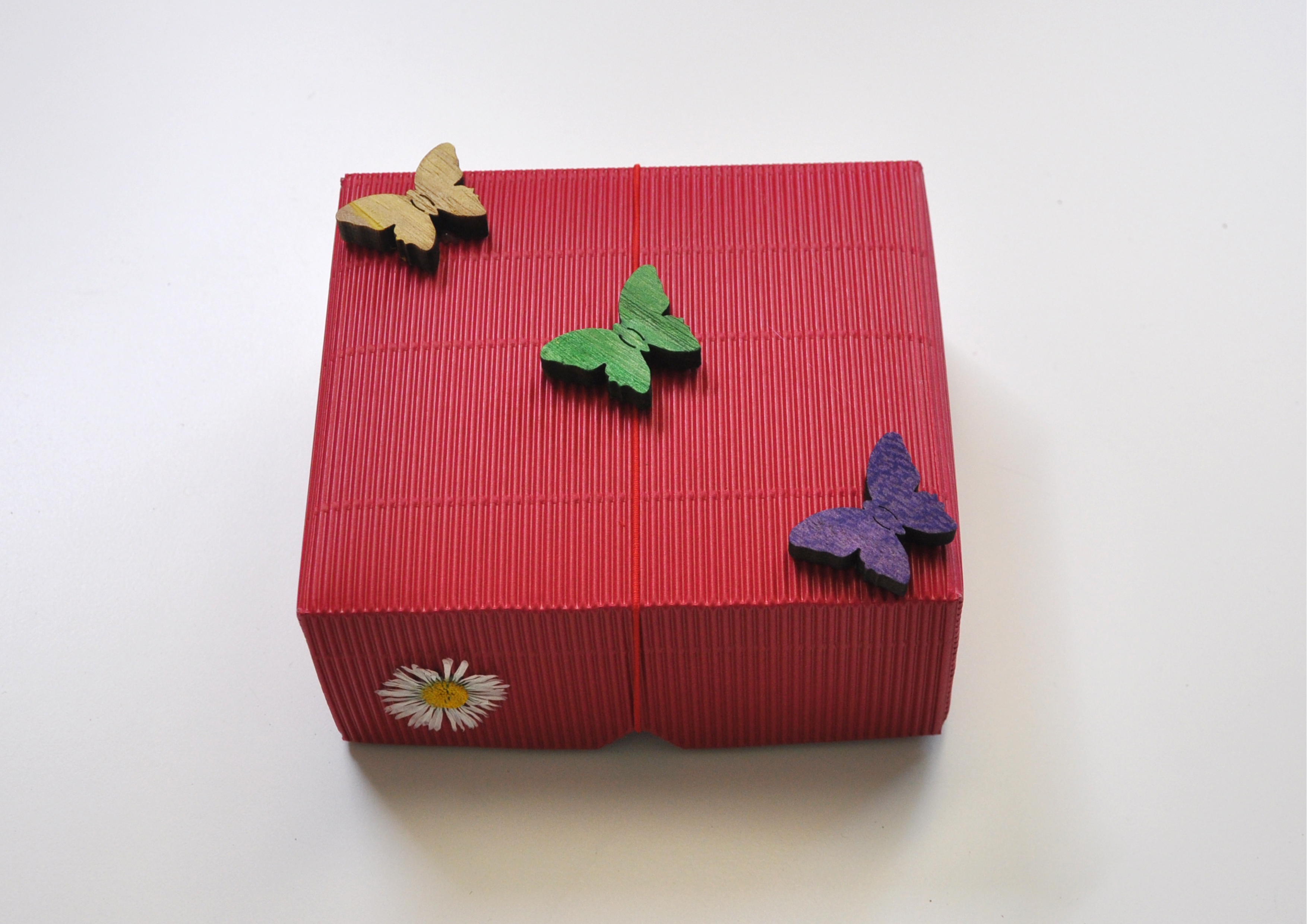 Schachtel mit Stülpdeckel - Motiv Schmetterling mit 1 getrocknetem Gänseblümchen und Schmetterlingen aus Holz als Deko.