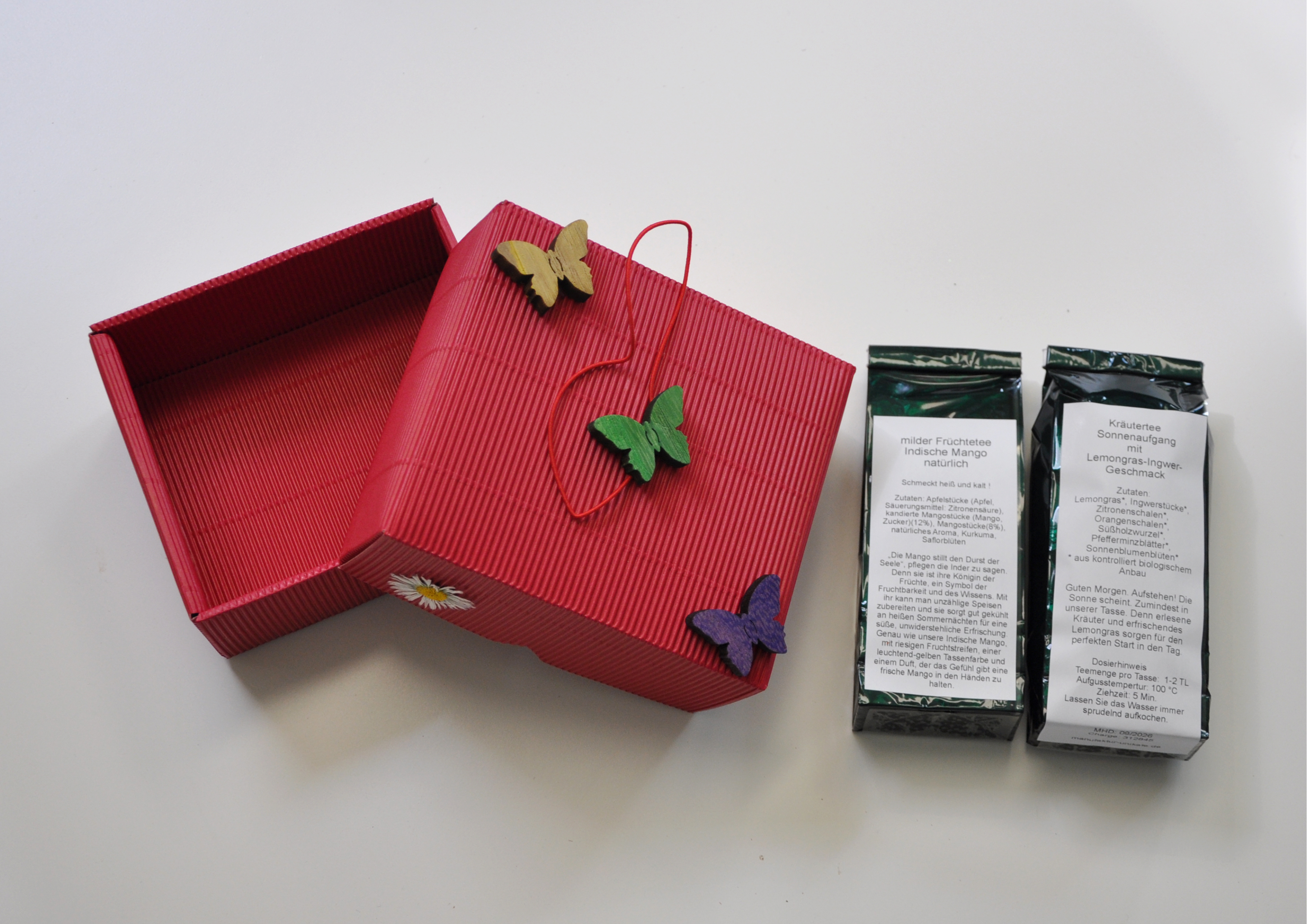 Geschenkschachtel Schmetterling gefüllt mit Früchte- und Kräutertee