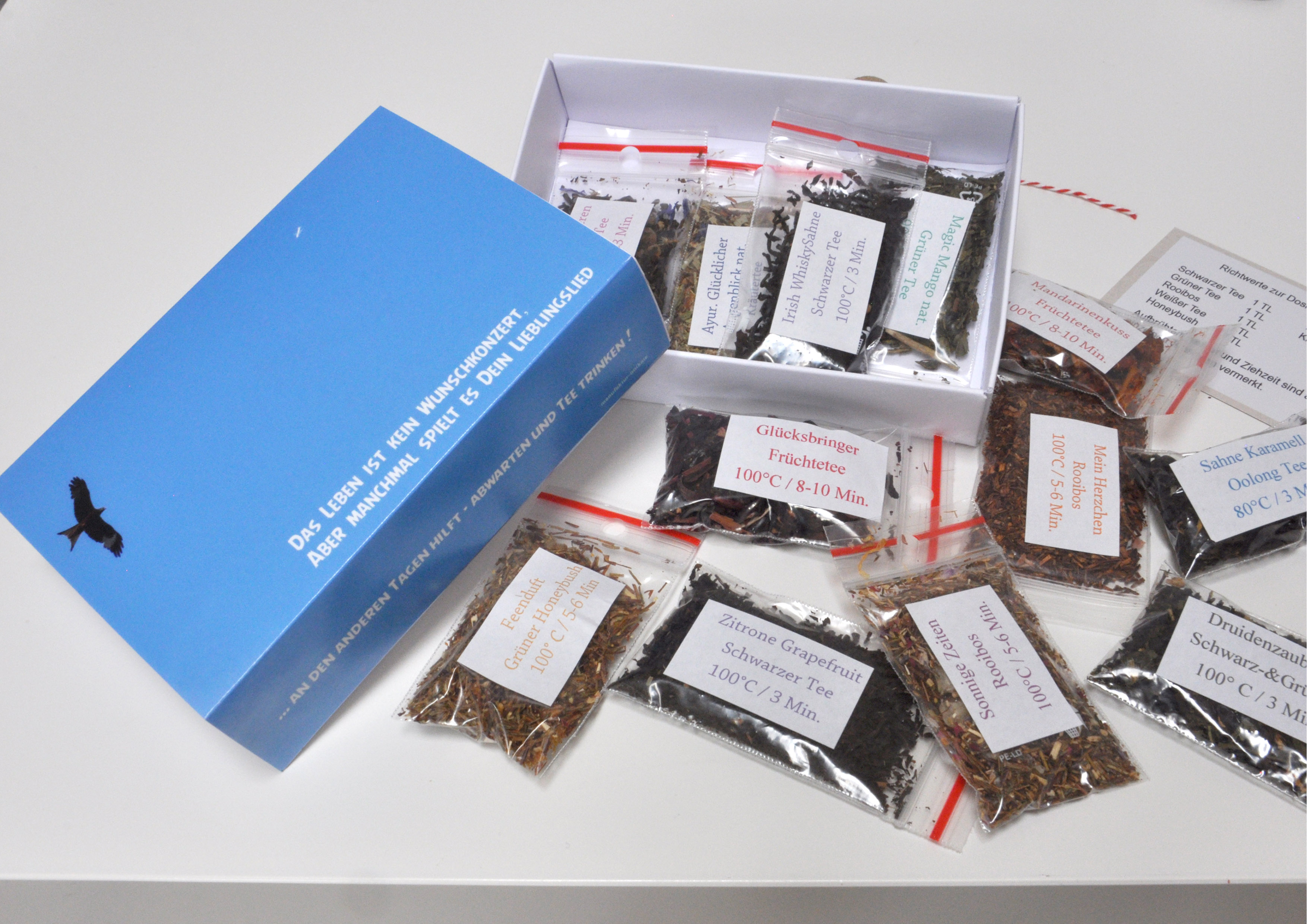 Die Geschenkbox ist gefüllt mit 12 Sorten frischen Tee, der nach der Bestellung in Druckverschlussbeutel verpackt wird - je 1 Tassenportion.