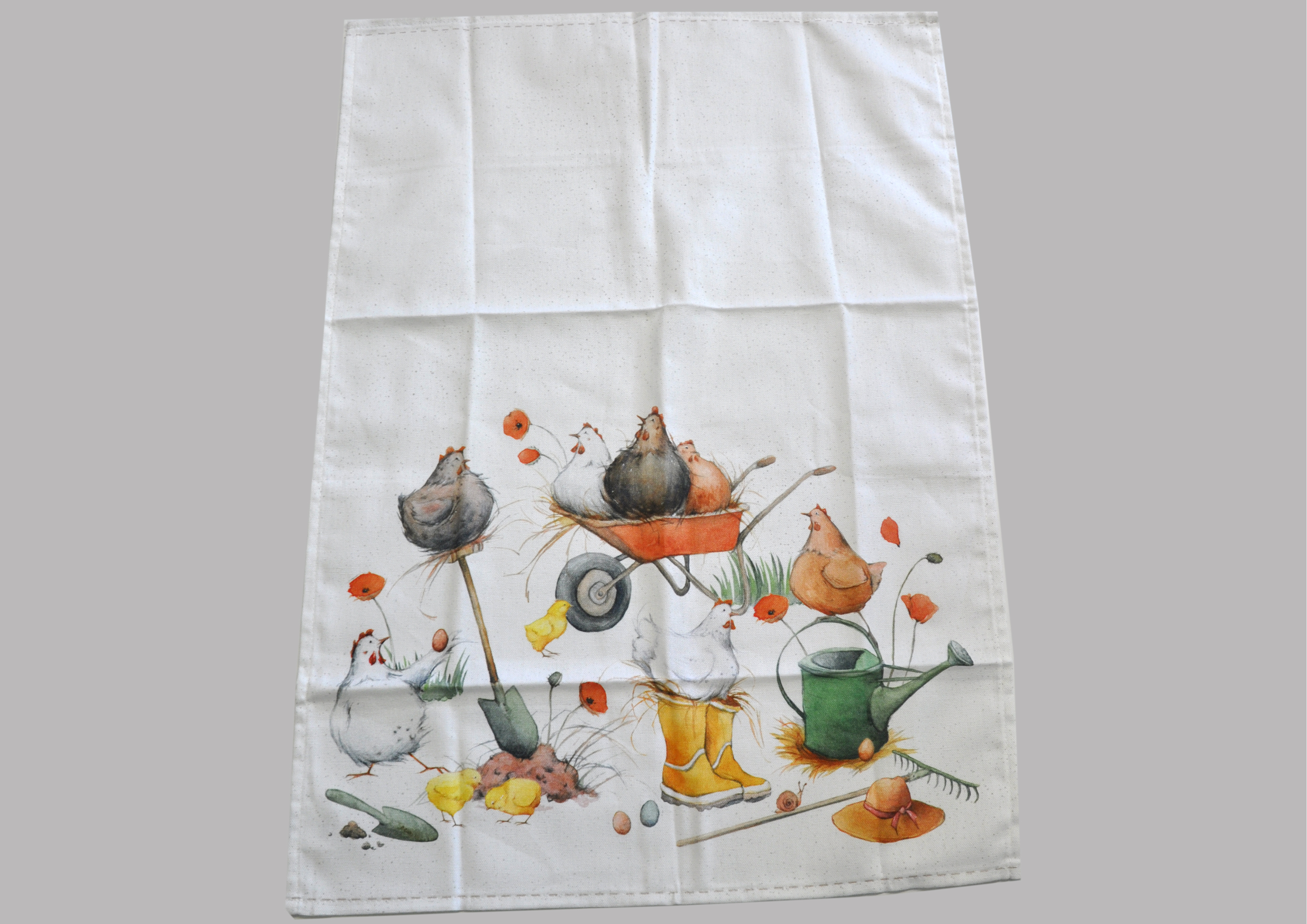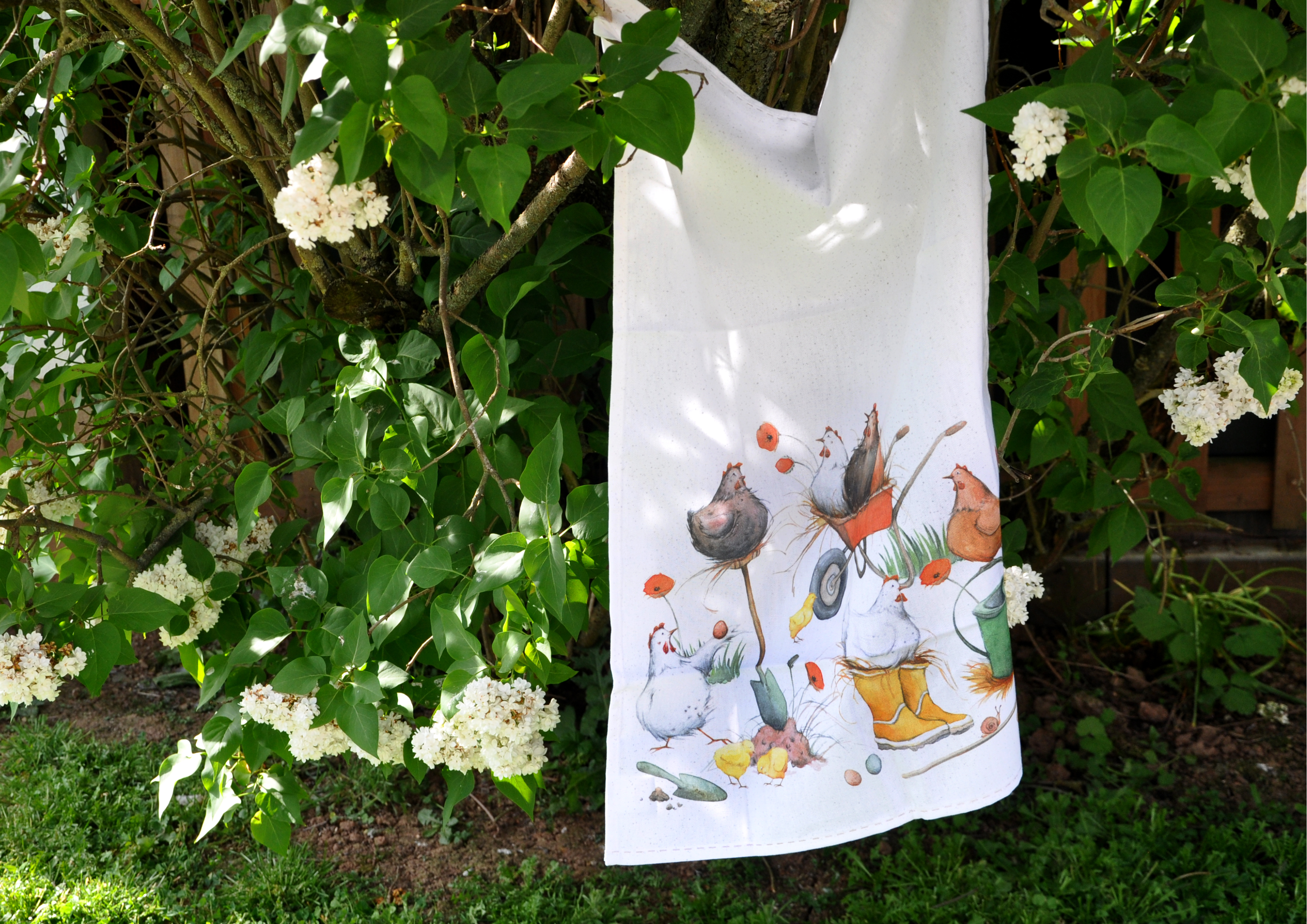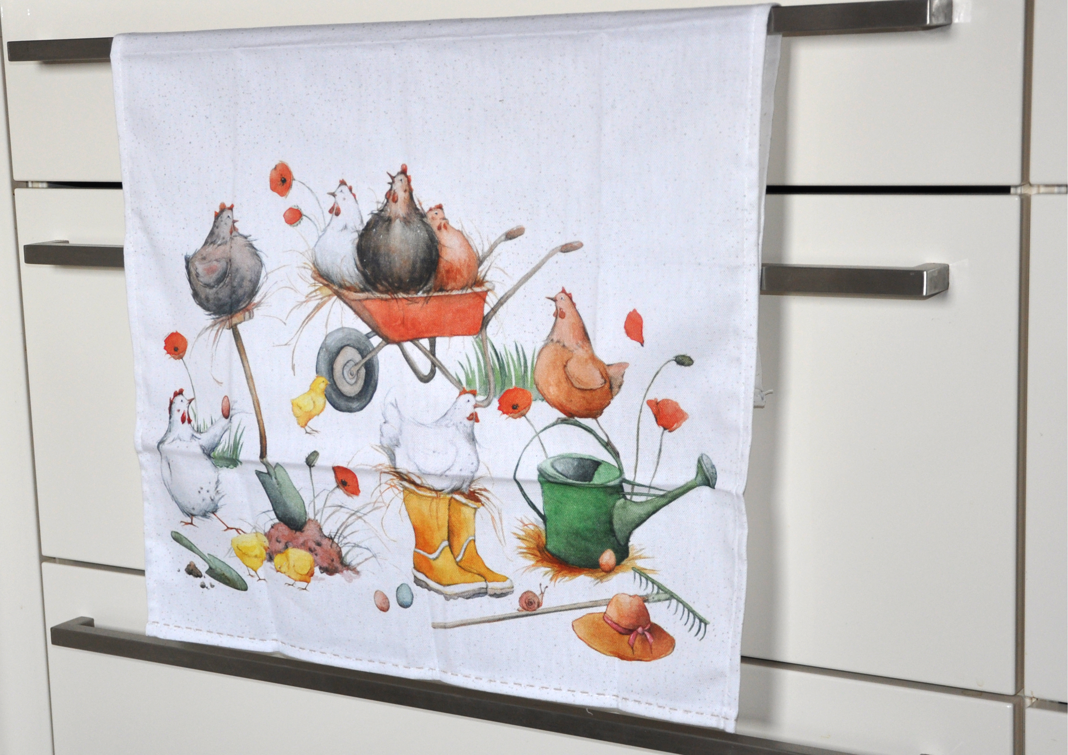 Hier sind die Hühner glücklich. Sie erkunden den Garten und fühlen sich wohl. Kleine Küken spazieren zwischen den Hennen umher. Es gibt einiges zu entdecken, auf diesem hübschen Geschirrtuch.